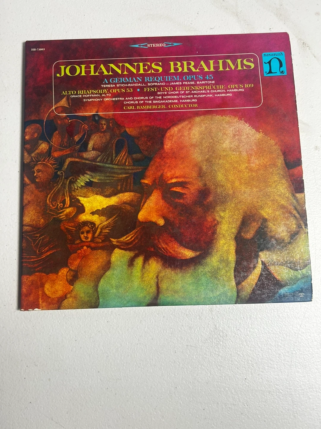 This Nonesuch Records vinyl features Johannes Brahms' A German Requiem, Opus 45, along with Alto Rhapsody, Opus 53 and Fest- und Gedenksprüche, Opus 109. Includes original liner notes with lyrics. A classic recording for any music enthusiast!