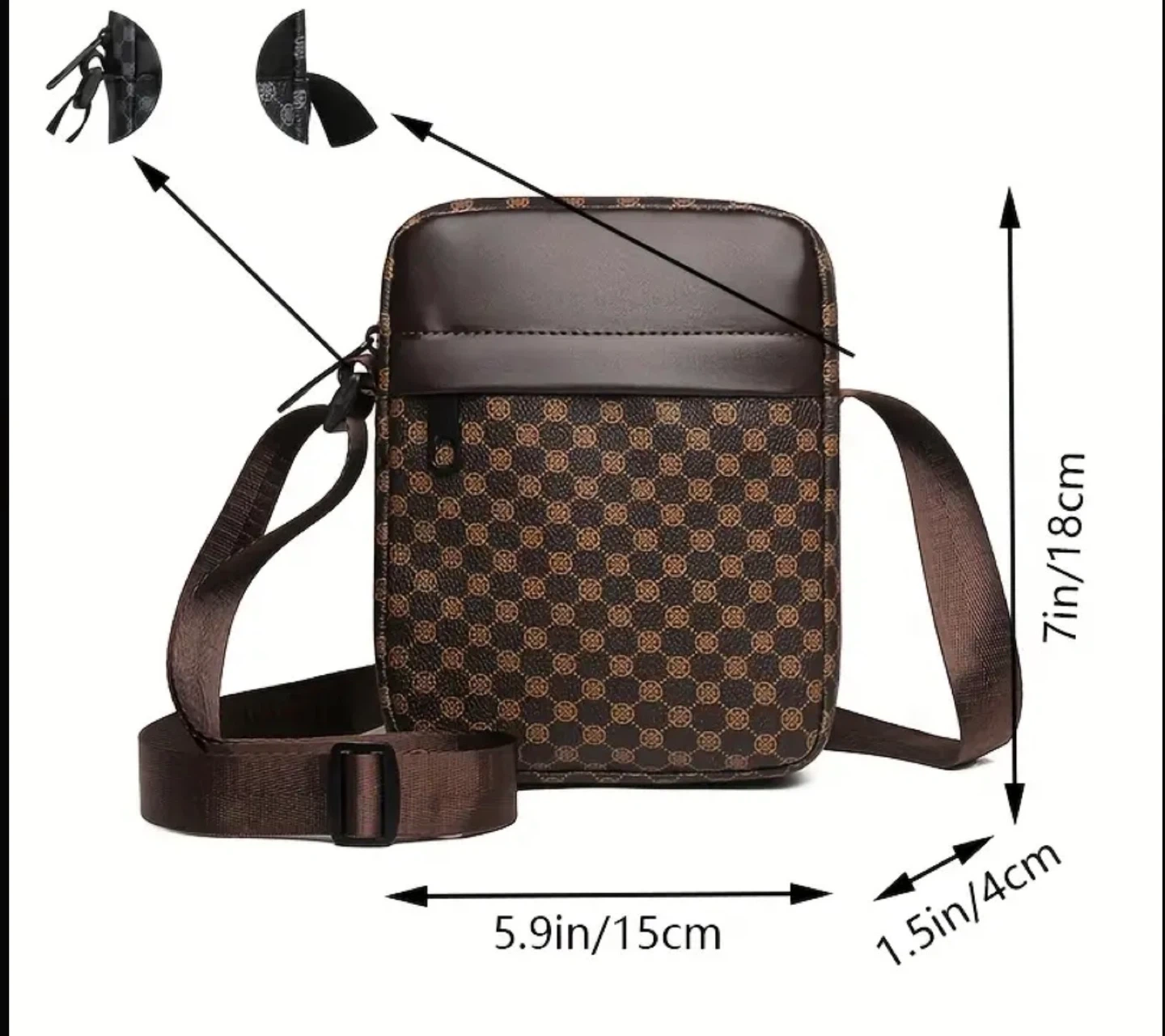This is a stylish men's crossbody bag featuring a classic monogram pattern. It's made from durable material and includes an adjustable strap for comfort.