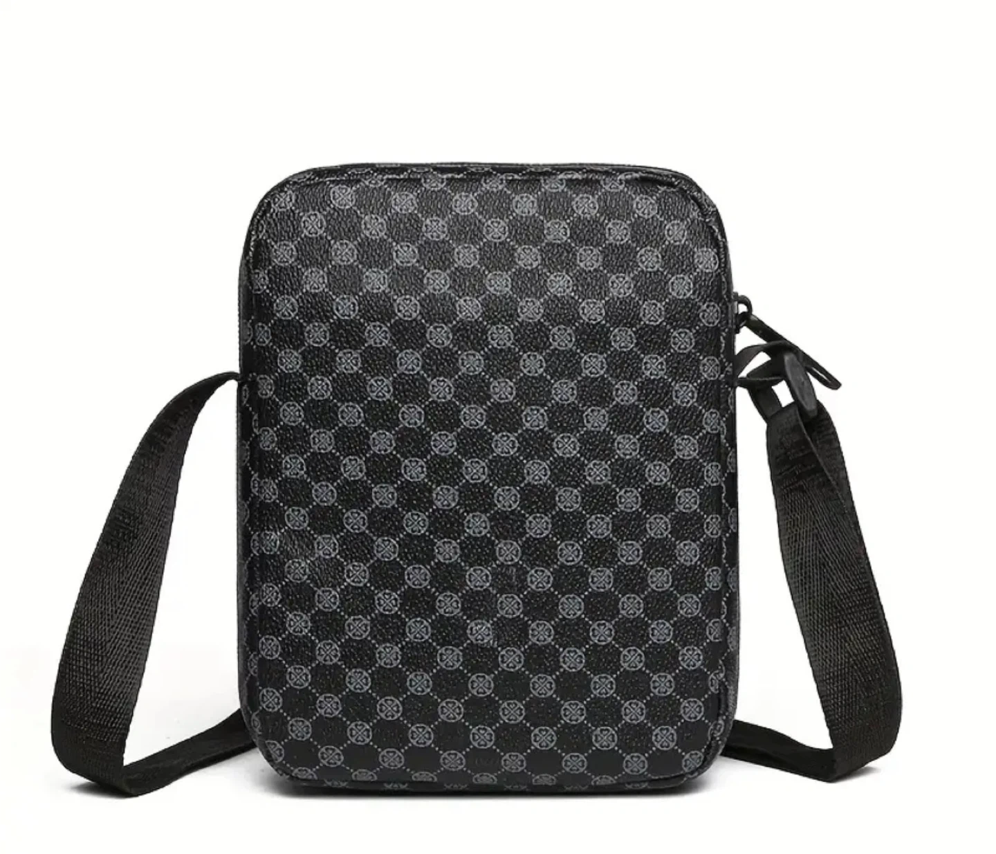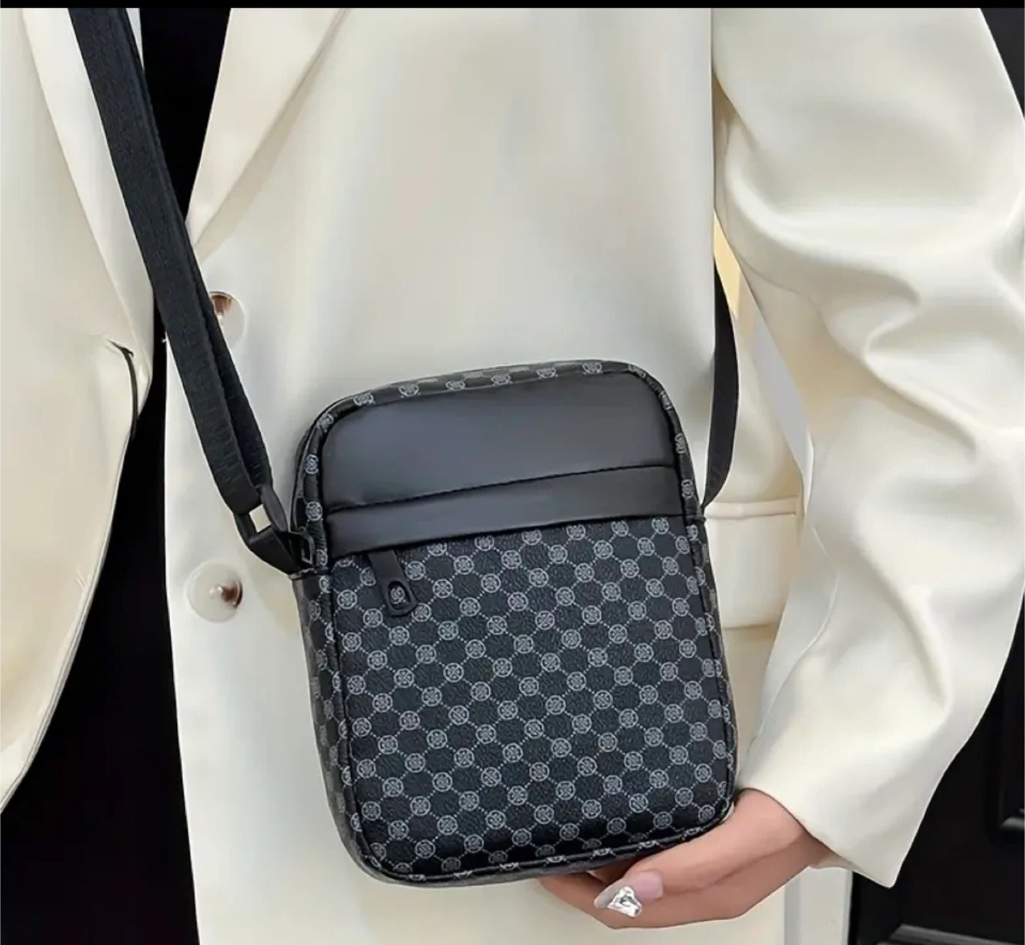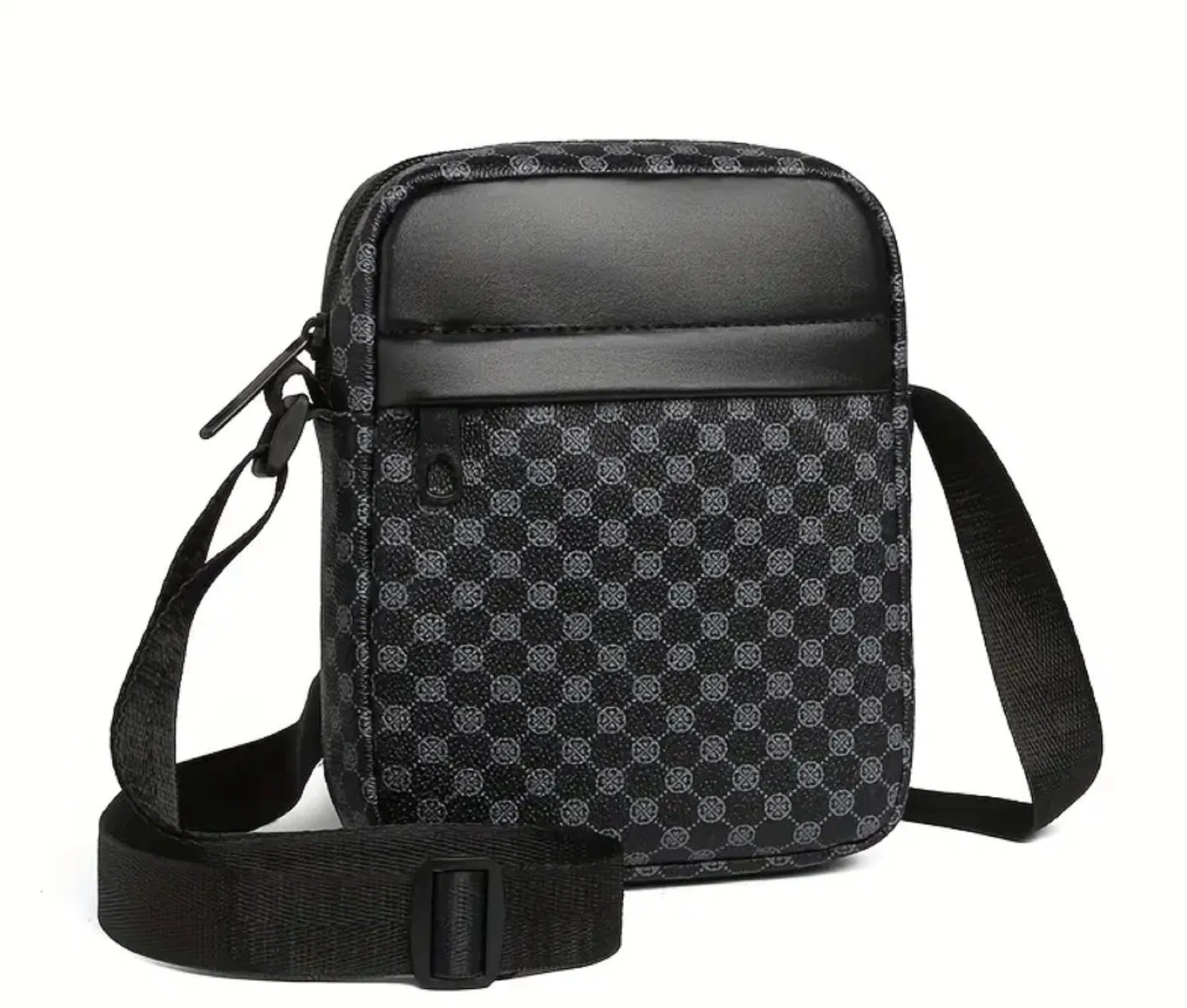 This is a stylish men's crossbody bag featuring a classic monogram pattern. It's made from durable material and includes an adjustable strap for comfort.