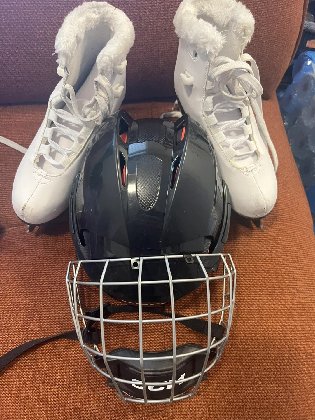 A pair of white figure skates with faux fur trim. Included is a black CCM hockey helmet.halmet is broken but still can be used.