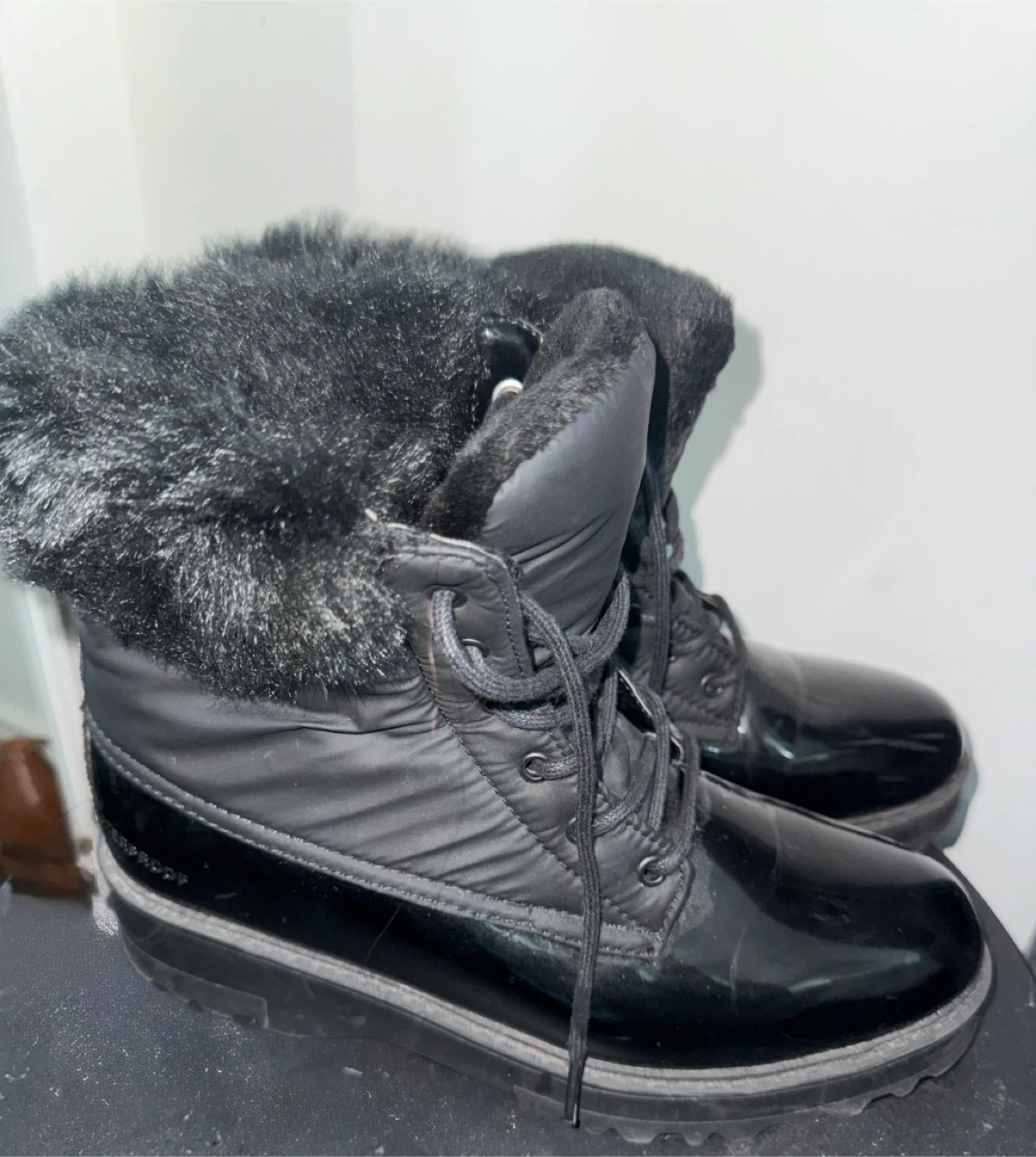 These ALDO winter boots are black with a cozy faux fur trim. They feature a shiny patent leather toe and sides with nylon uppers. Laces provide a secure fit. Keeps your feet warm during colder months! We’re in the midst of a Polar Vortex👉get these ☃️ Price is negotiable.