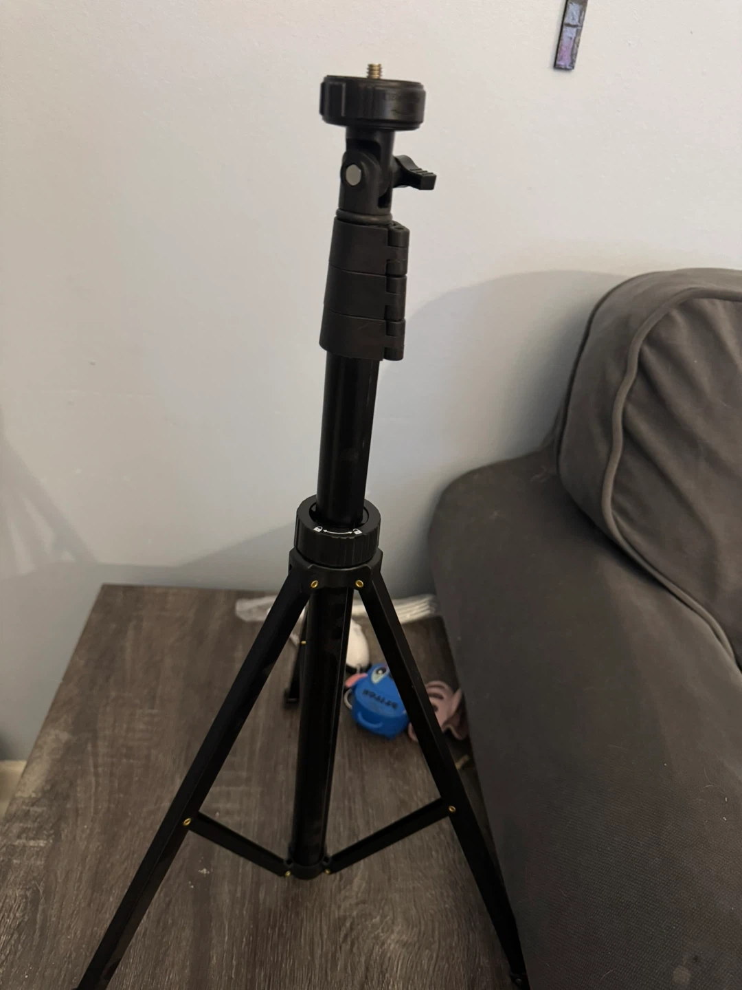 This is a black adjustable tripod. It's made of metal and plastic components. It's useful for stabilizing cameras or lights for photography or videography.