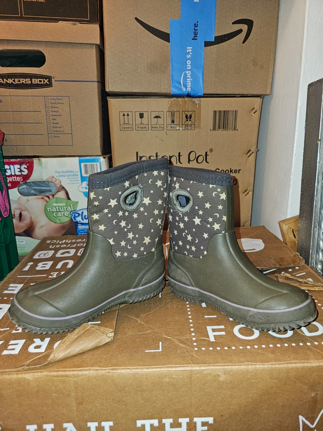 These are children's Bogs boots in a size 12. They are green with a moon and stars pattern on the top cuff. Perfect for keeping little feet dry!