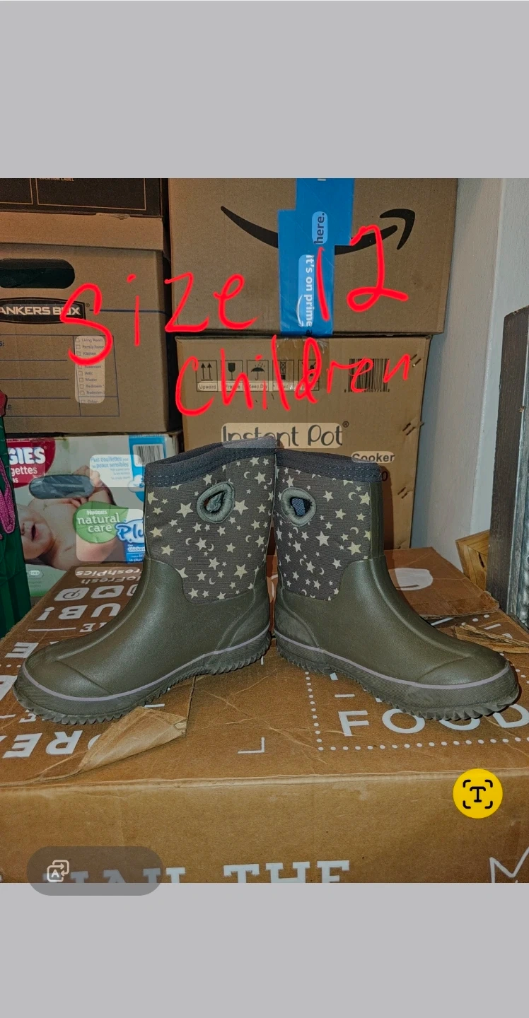 These are children's Bogs boots in a size 12. They are green with a moon and stars pattern on the top cuff. Perfect for keeping little feet dry!