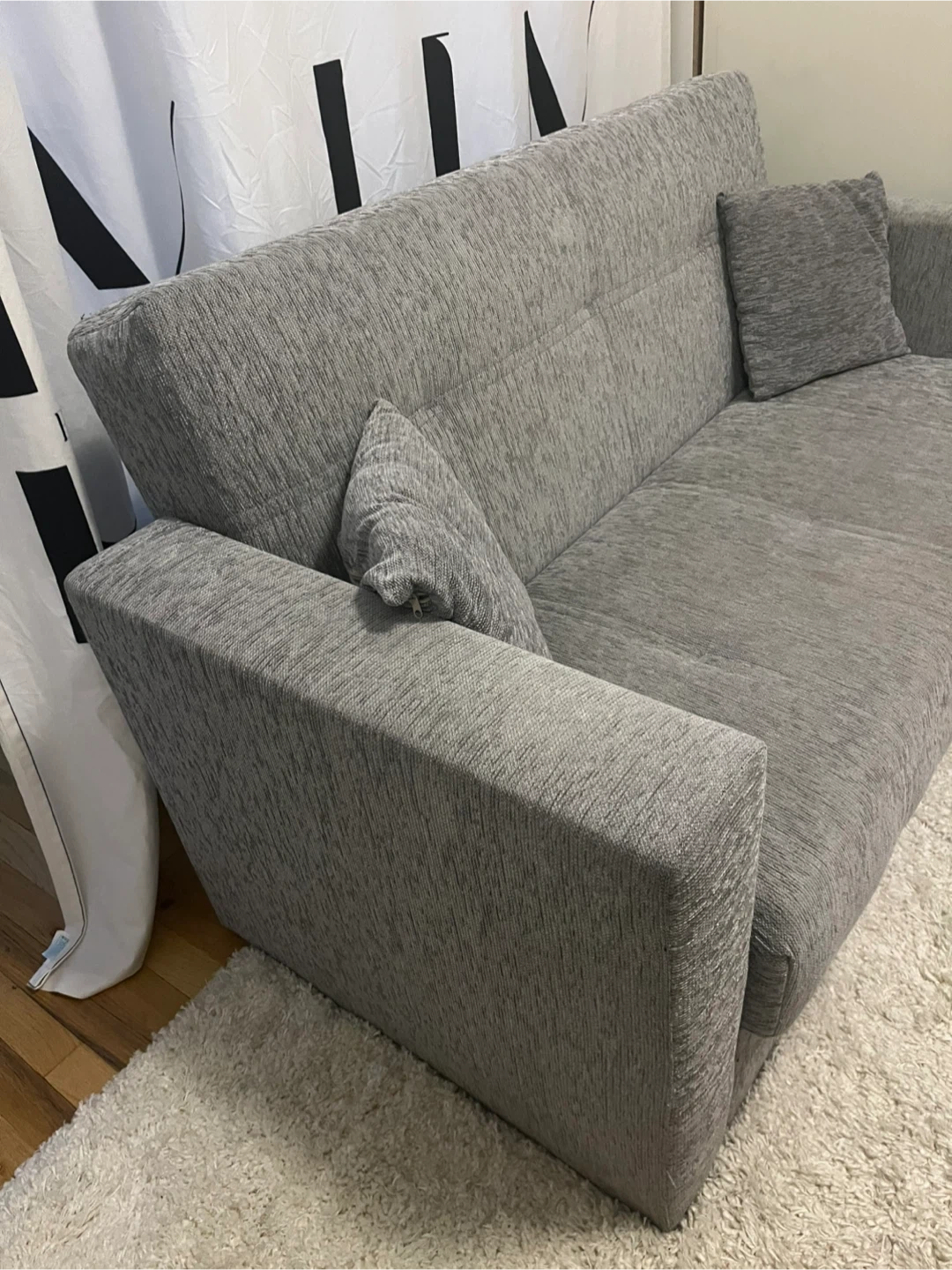 This grey sofa is upholstered in a textured fabric. It includes two matching throw pillows. It can be converted into a bed.