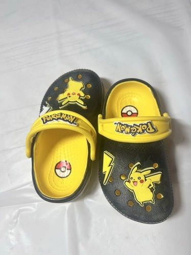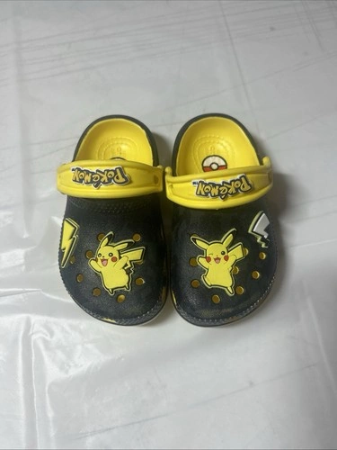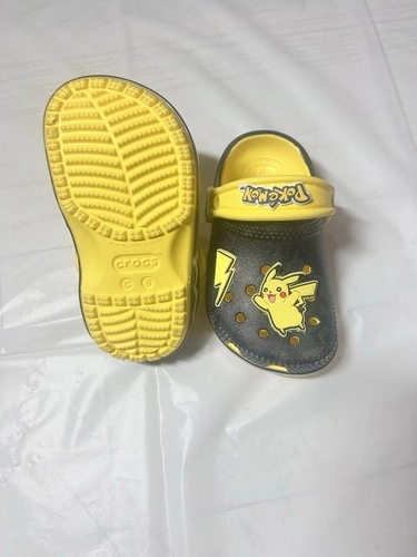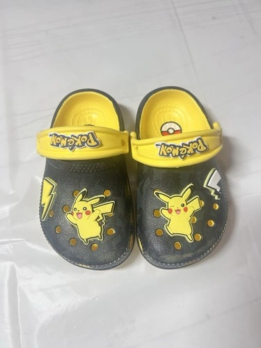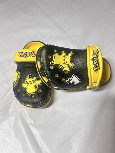 Limited edition slip-on clogs featuring a round toe, flat heel, and rubber outsole. Perfect for casual occasions in the summer and spring. These clogs offer moderate cushioning and are ideal for both kids and adults. The black color with Pikachu logo accents make them a fun and stylish choice for any Pokémon fan. Features a low top shoe shaft style and rubber upper and insole material for comfort and durability.