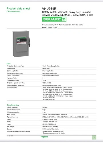 This is a high-quality Square D single throw safety switch made of corrosion-resistant metal. It's suitable for AC current and provides a reliable way to control power supply with its switch fuse type. Perfect for applications requiring a 200A rated connection, offering a secure and efficient power distribution solution.