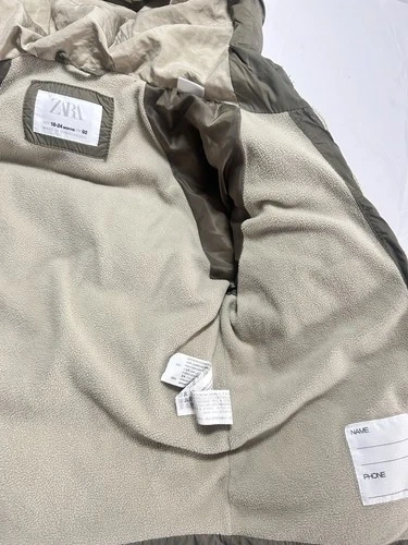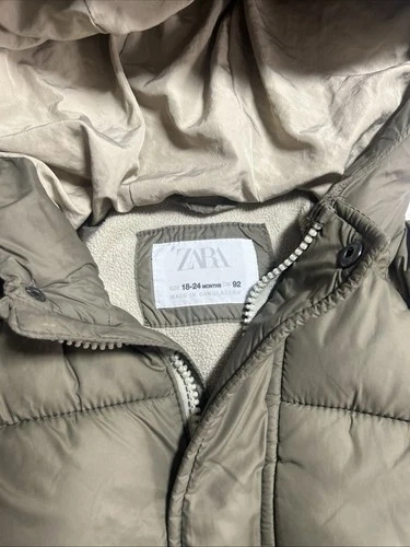 This Zara waterproof down jacket for children in size 18-24 months is a practical and stylish choice for the winter season. Made with 100% polyester outer shell material and polyester insulation, this long-sleeve puffer jacket features a zip closure and is machine washable for easy care. The beige color and casual style make it versatile for everyday wear, while the winter season performance ensures comfort during outdoor activities like walking. Perfect for both boys and girls, this Zara jacket combines quality and fashion in one warm and cozy garment.