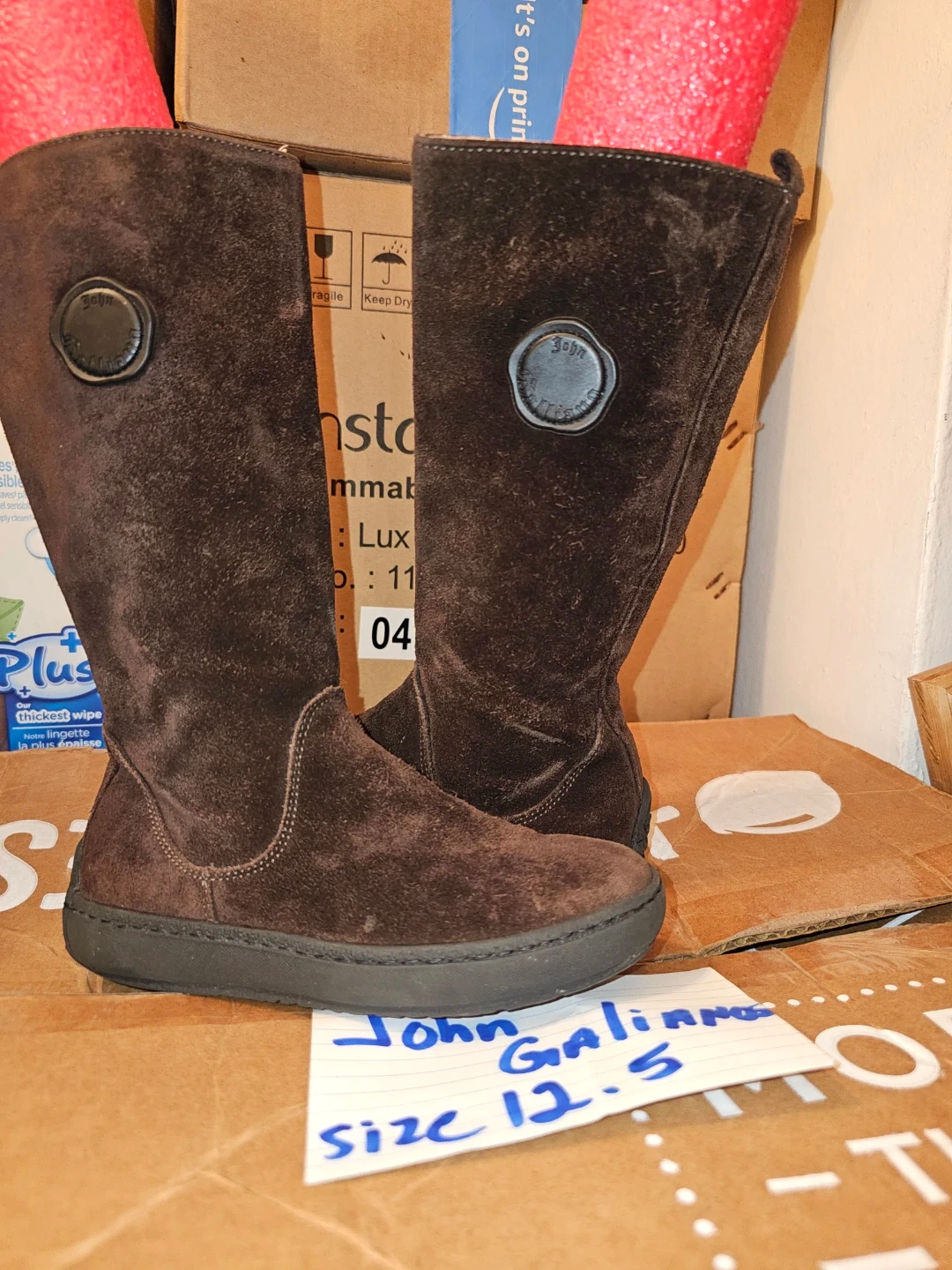 Brown suede boots from John Galliano. Side zippers for easy on and off. Leather Lined