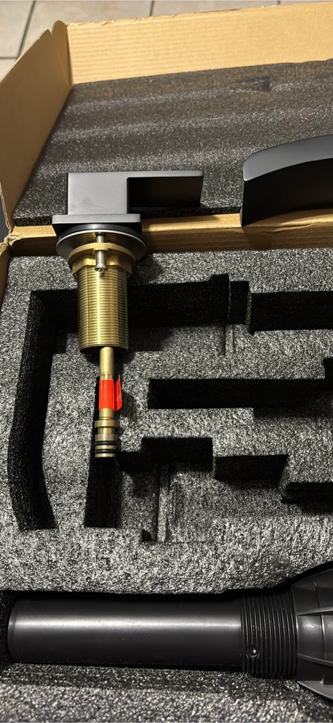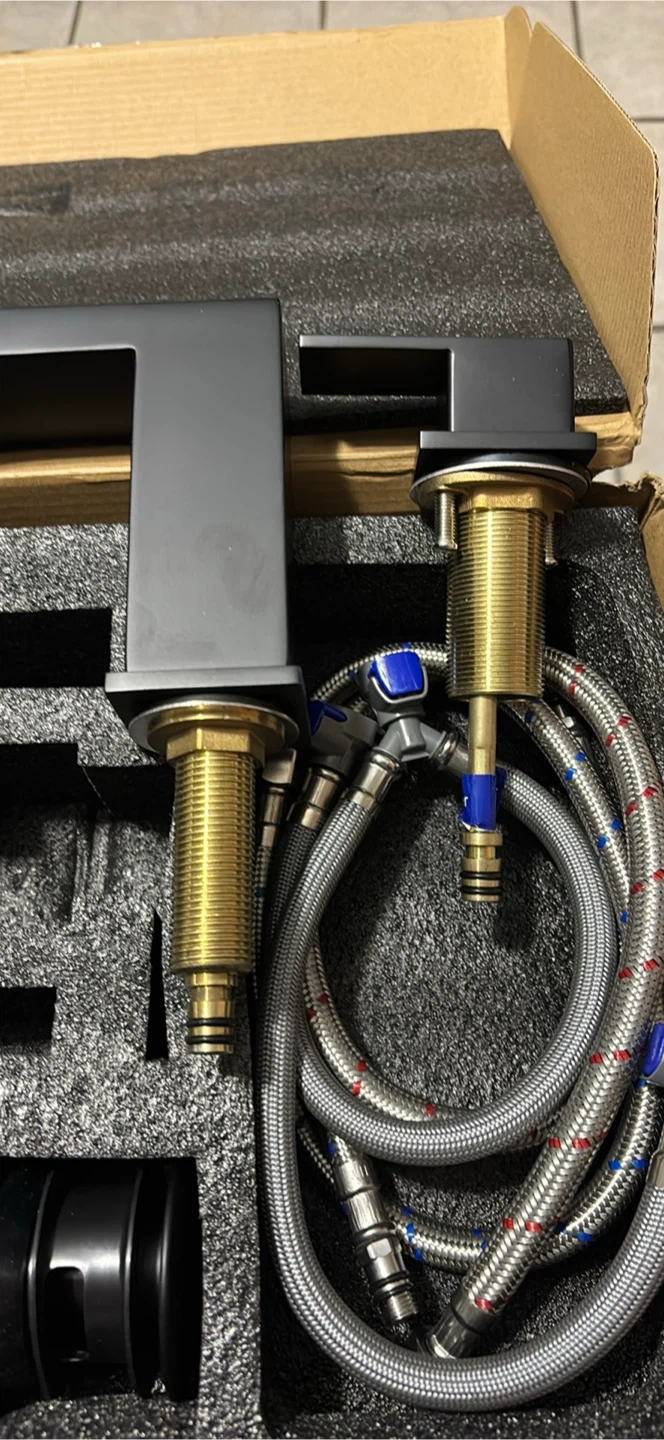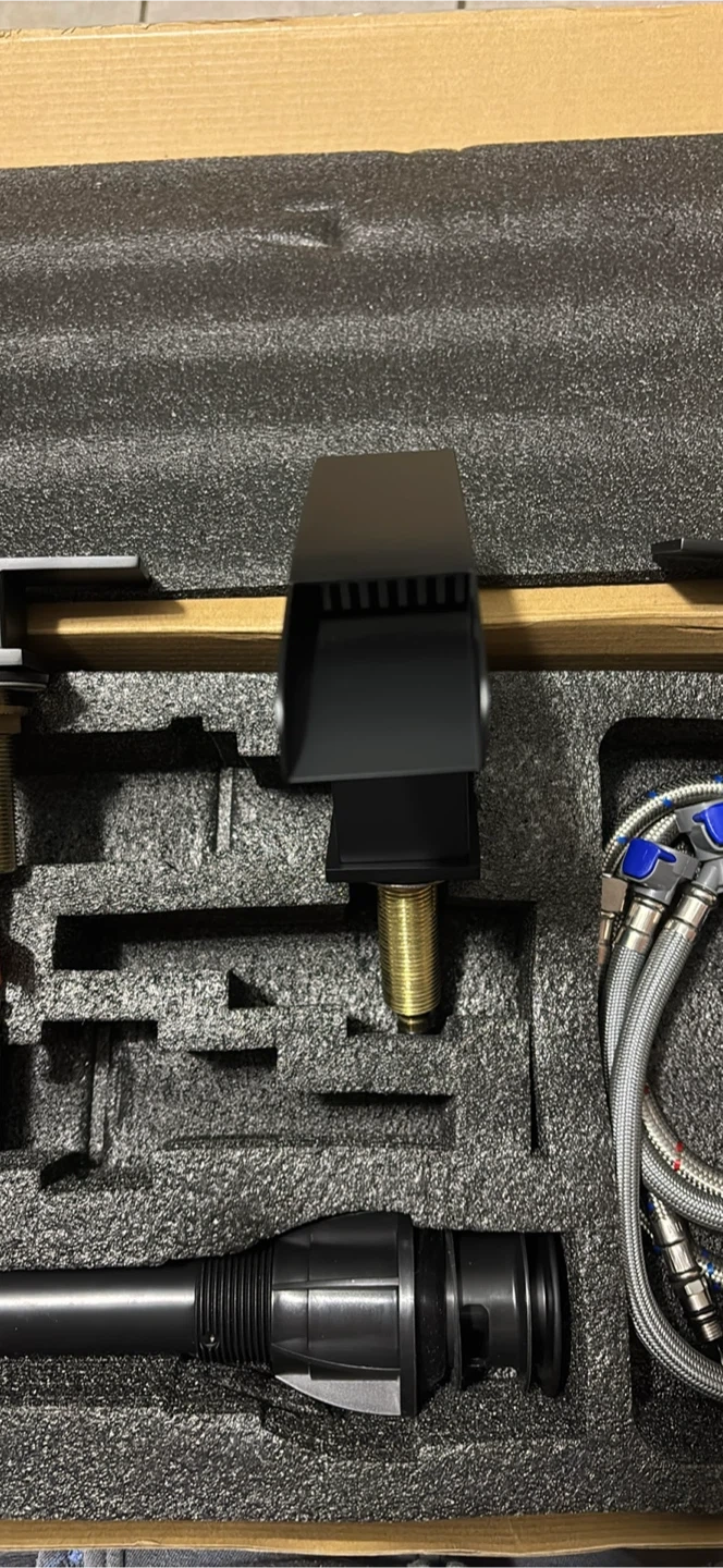 This is a new black waterfall faucet set, complete with hot and cold water hoses. It's made of durable brass and features a sleek, modern design. This faucet set is perfect for updating any bathroom or vanity.