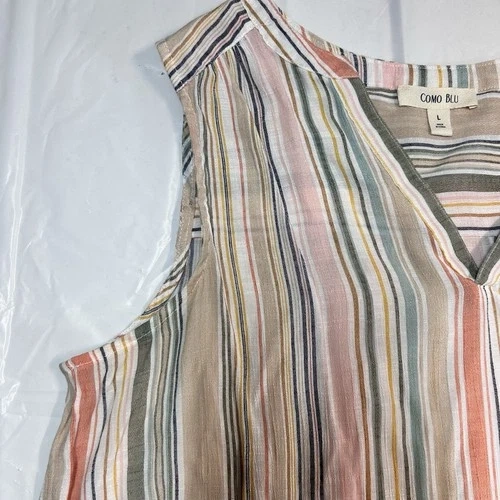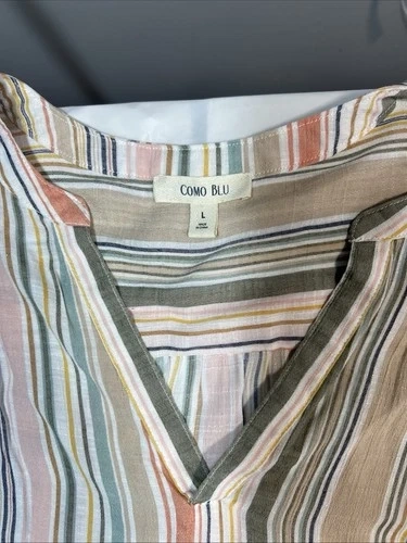 This Como Blu striped V-neck blouse is a stylish and versatile piece for casual occasions. Made from a comfortable blend of polyester and rayon, this pullover blouse features a classic striped pattern and a flattering V-neckline. Easy to care for with machine washable instructions, this multicolor blouse is perfect for summer and spring seasons. The basic style and regular fit make it a timeless addition to any woman's wardrobe.