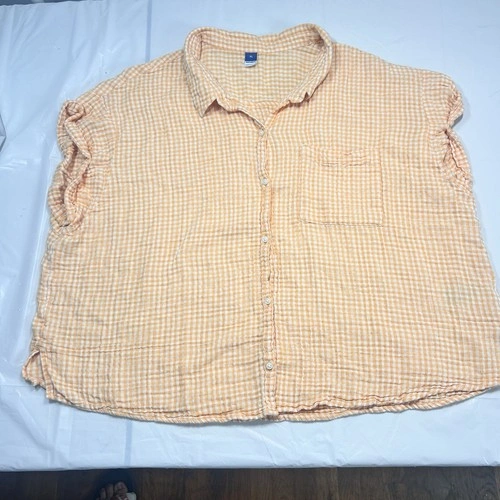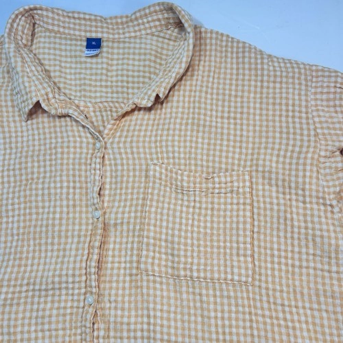 The Old Navy XL Orange and White Gingham Button-down Shirt is a versatile and classic piece made from 100% cotton. This stylish button-up shirt is perfect for casual occasions, featuring a charming orange color and a comfortable size XL. The shirt is buttoned up with a classic design, making it a great addition to your summer, fall, or spring wardrobe. With its timeless style, basic design, and gingham pattern, this shirt is a must-have for women seeking a wardrobe staple that is both trendy and comfortable.