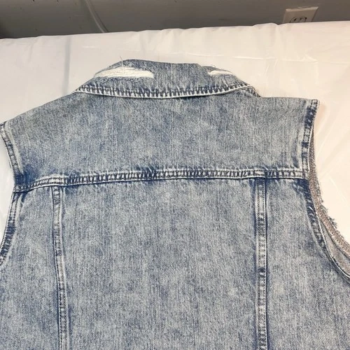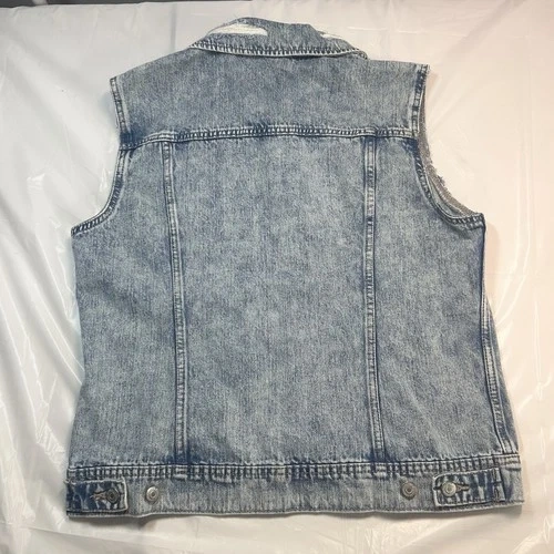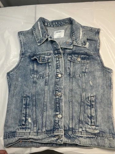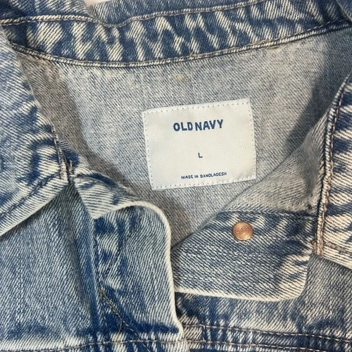 This Old Navy denim jacket in size L for women is a stylish and versatile outerwear piece made from cotton denim fabric. This short-length jacket features a button closure and a regular fit, perfect for casual occasions in the winter, fall, and spring seasons. With its classic blue color and basic jacket style, this piece is easy to care for with machine washable instructions. The jacket is not vintage and is not handmade.