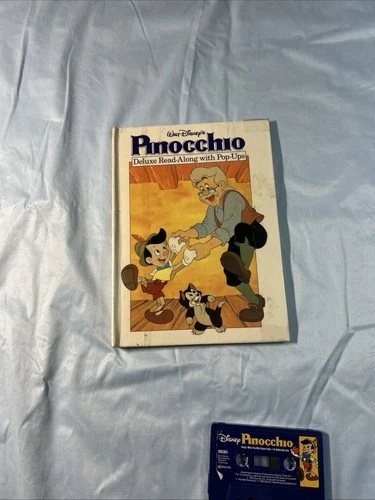 This is a vintage Walt Disney's Pinocchio Deluxe Read-along book with pop-ups and a cassette. It features story panels with pop-up elements that bring the story to life as you read along. The cassette allows you to listen to the story while following the pop-up panels, creating an immersive reading experience. Perfect for collectors or those looking to revisit a classic Disney tale.