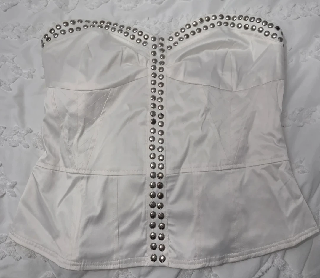 This white corset top features a satin-like material and silver stud detailing along the bust and front zipper. It has a peplum hem and a zippered back closure. This piece adds a bit of edge to any outfit!