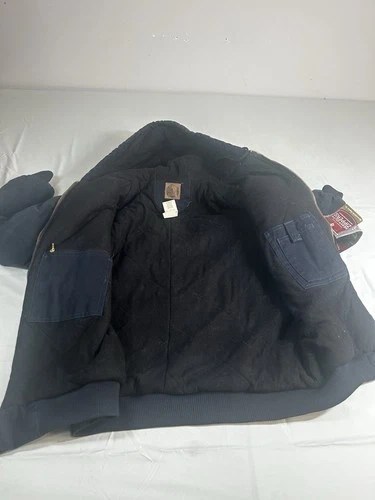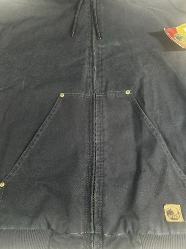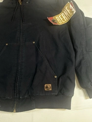 This is a dark blue cotton Berne jacket for men in size XL. It's designed for a hard-working style and features multiple pockets inside the chest for added functionality. A durable and practical outerwear option.