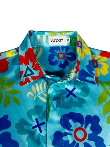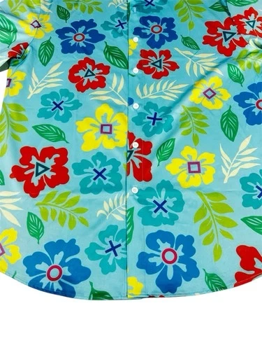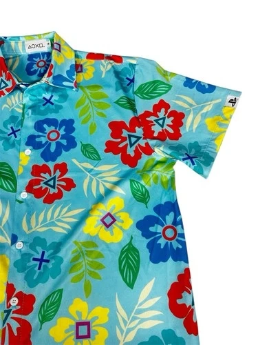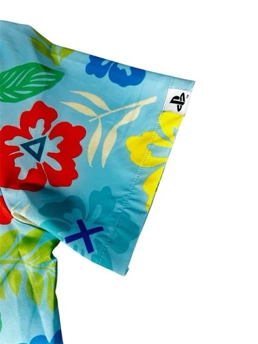 This unisex T-shirt features the PlayStation logo in a Hawaiian design. It's a vintage piece from the 2000s, made of polyester material in a vibrant multicolor palette. With a regular fit in size M, this shirt is perfect for fans of both PlayStation and Hawaiian culture, making it a unique and stylish addition to any wardrobe. The PlayStation product line adds a touch of nostalgia.