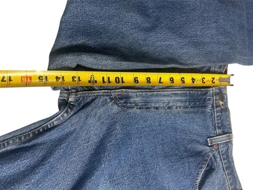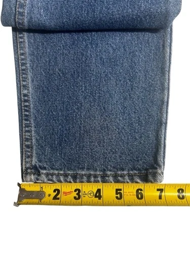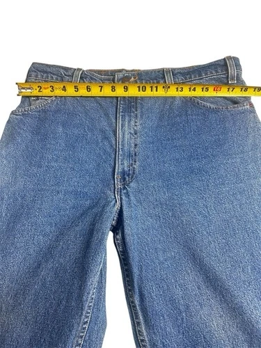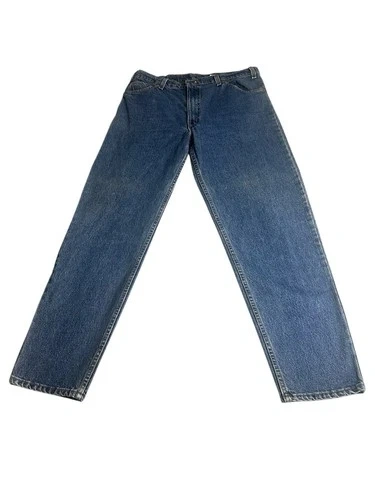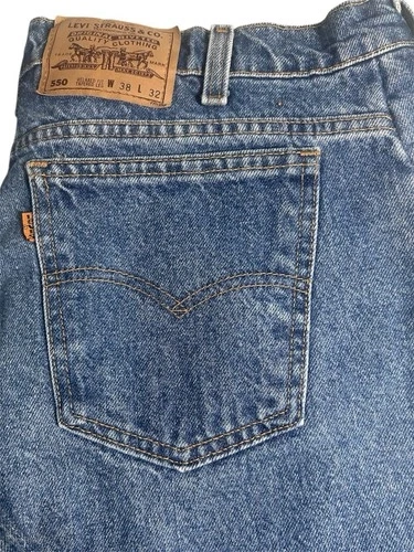 Pair of Levi’s 550 vintage jeans for men with an orange tag, made in the USA. These jeans feature a classic blue color with a medium wash, crafted from cotton denim fabric. They have a zip closure and a 5-pocket design, with a tapered style and a 32-inch inseam. The Levi's brand ensures quality and a timeless American theme, perfect for men looking for a piece of iconic denim history.