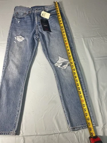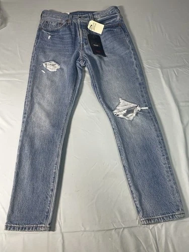 These Levi's Women’s Skinny 501 Jeans are a stylish and high-rise pair, perfect for any wardrobe. They feature a sleek skinny style with a comfortable regular fit, made from 100% cotton for durability and quality. The iconic Levi's 501 model has a classic 5-pocket design. The size is 28x28 and the color is blue, making these jeans versatile and easy to match with any outfit.
