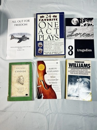 This lot includes the following books: All out for freedom, one act plays, Voltaire's Candide, 3 tragedies, Aaron Copland, and Tennessee Williams. Let me know if you're interested!