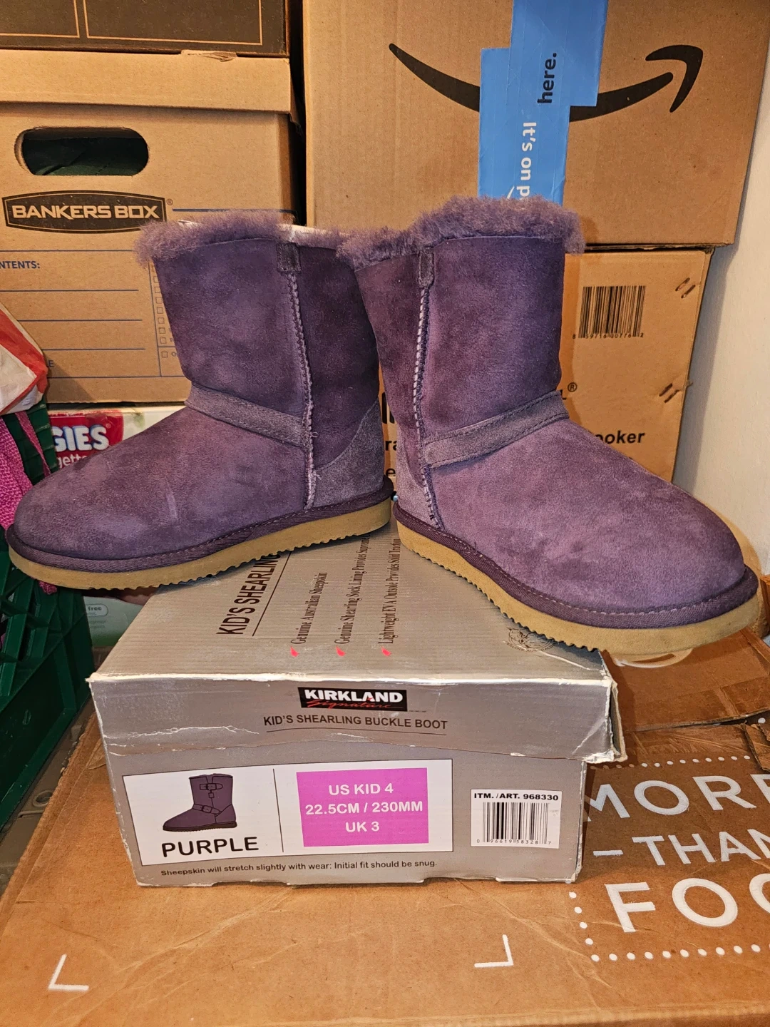 These Kirkland Signature boots are made for kids and come in a fun purple color. They feature shearling lining for warmth and buckle accents. The size is US Kid 4, which is equivalent to 22.5cm or UK 3. Sheepskin will stretch slightly with wear, so an initial snug fit is recommended.
