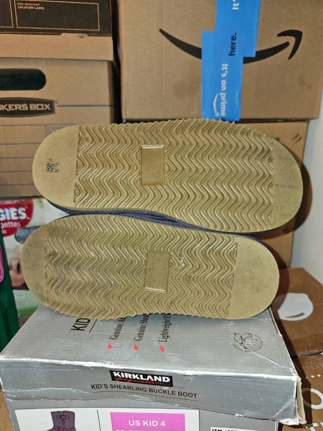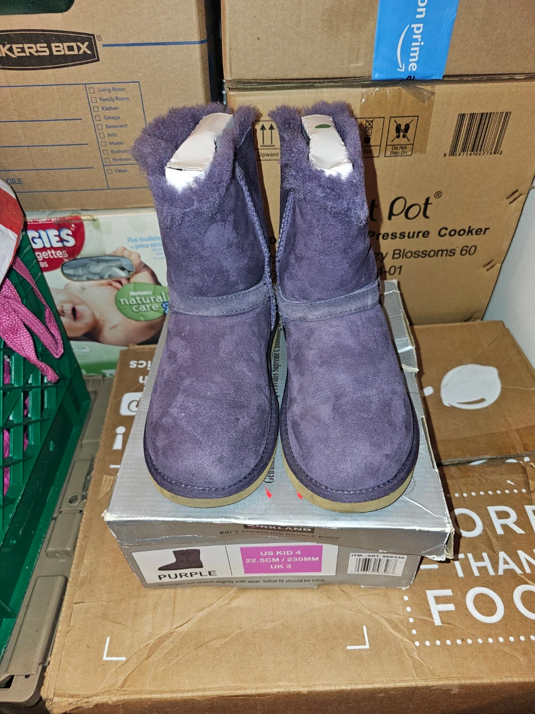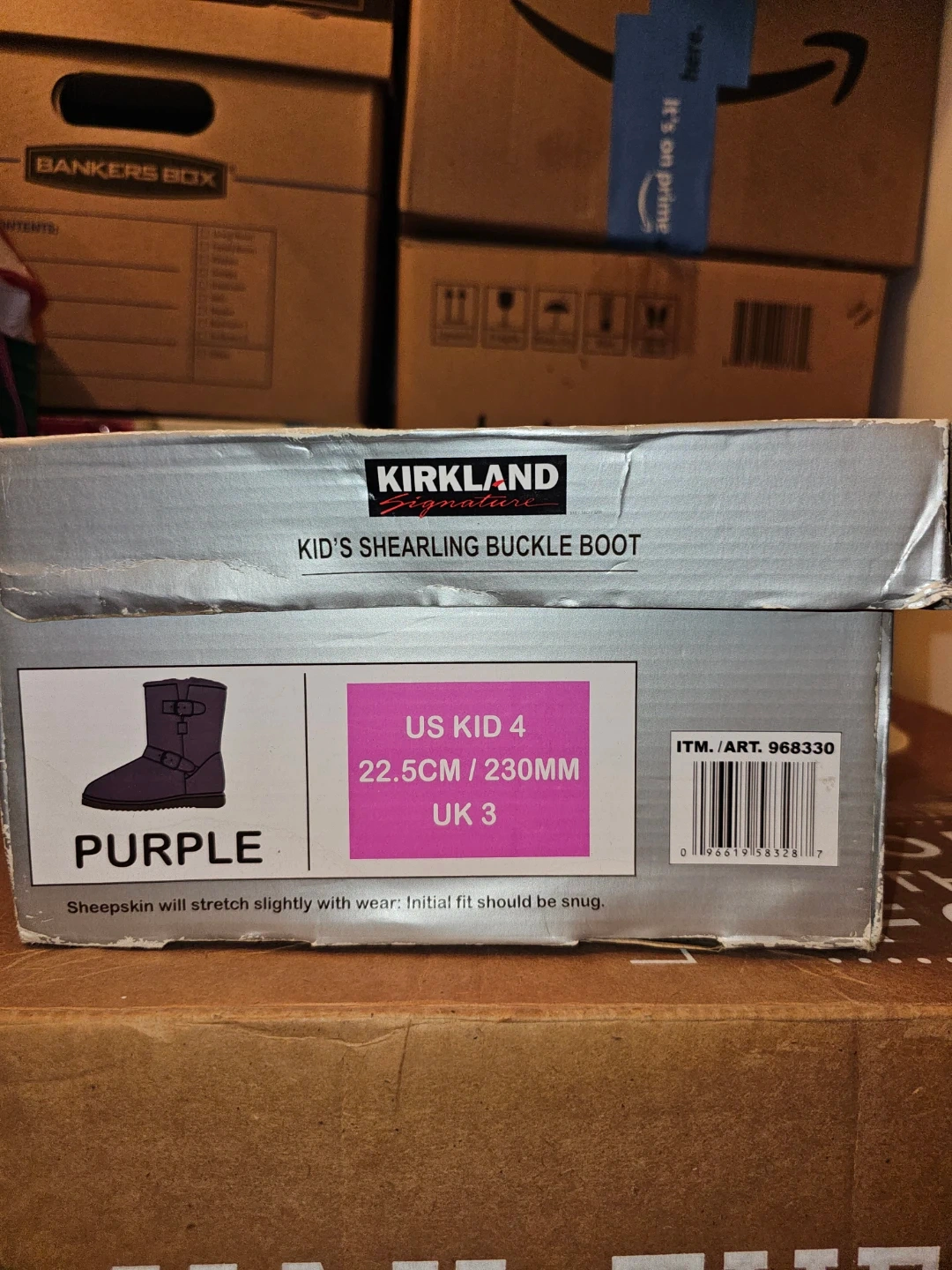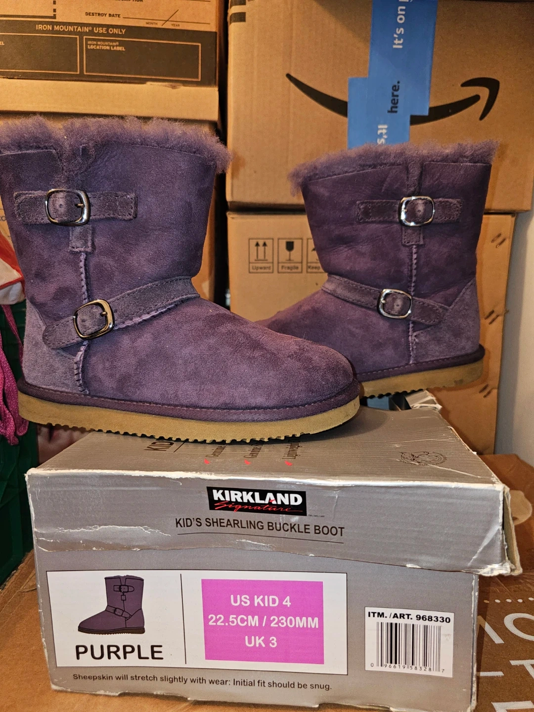 These Kirkland Signature boots are made for kids and come in a fun purple color. They feature shearling lining for warmth and buckle accents. The size is US Kid 4, which is equivalent to 22.5cm or UK 3. Sheepskin will stretch slightly with wear, so an initial snug fit is recommended.