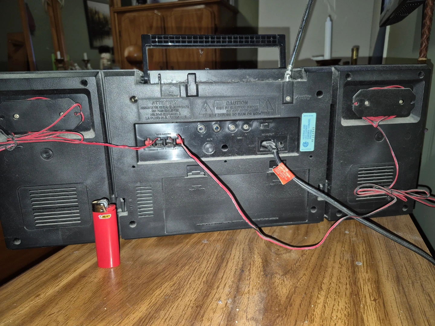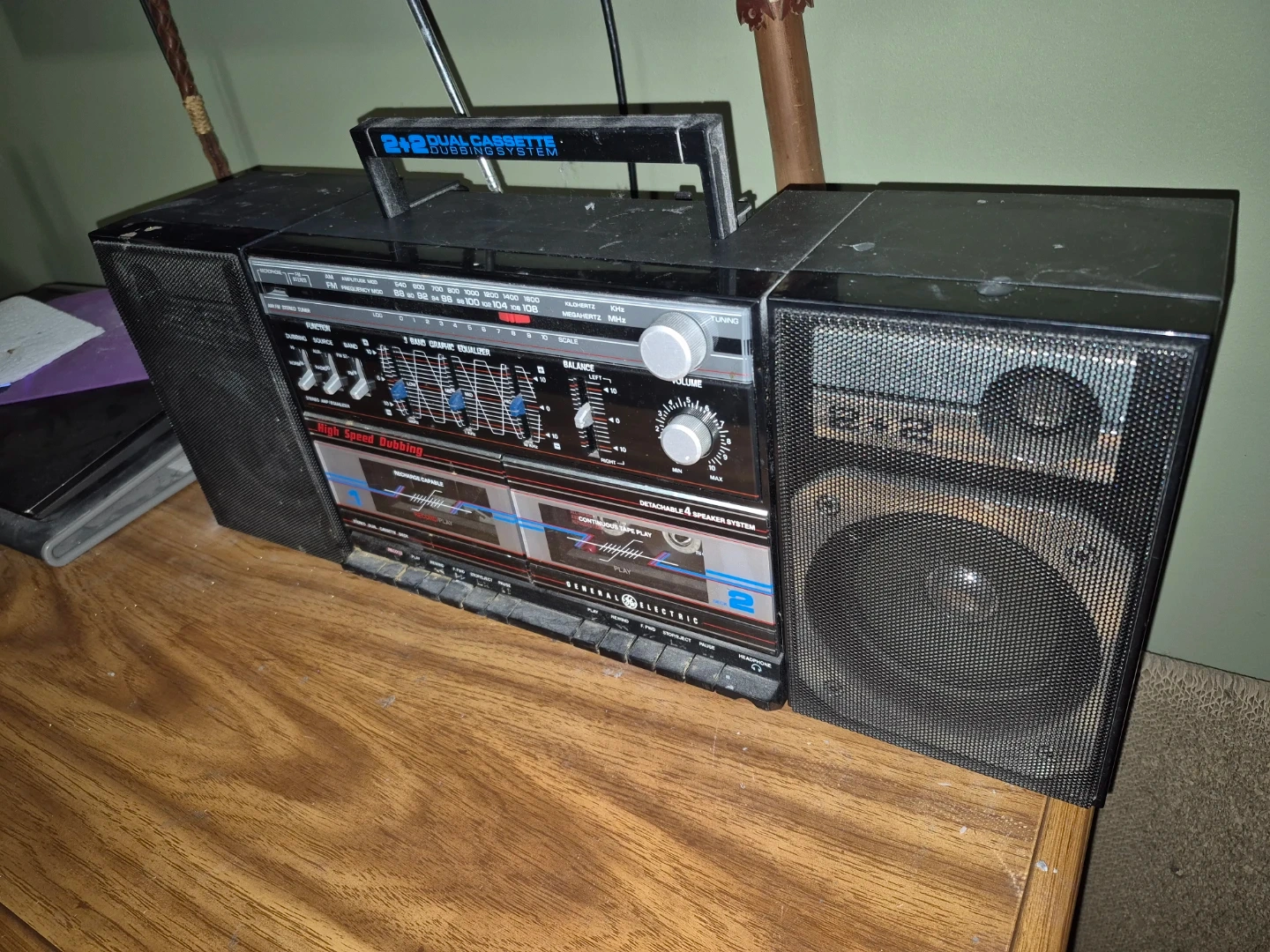 Classic GE boombox featuring a dual cassette deck with high-speed dubbing capabilities and AM/FM radio. It also includes a 5-band graphic equalizer and detachable speaker system for versatile sound. This unit is rechargeable.