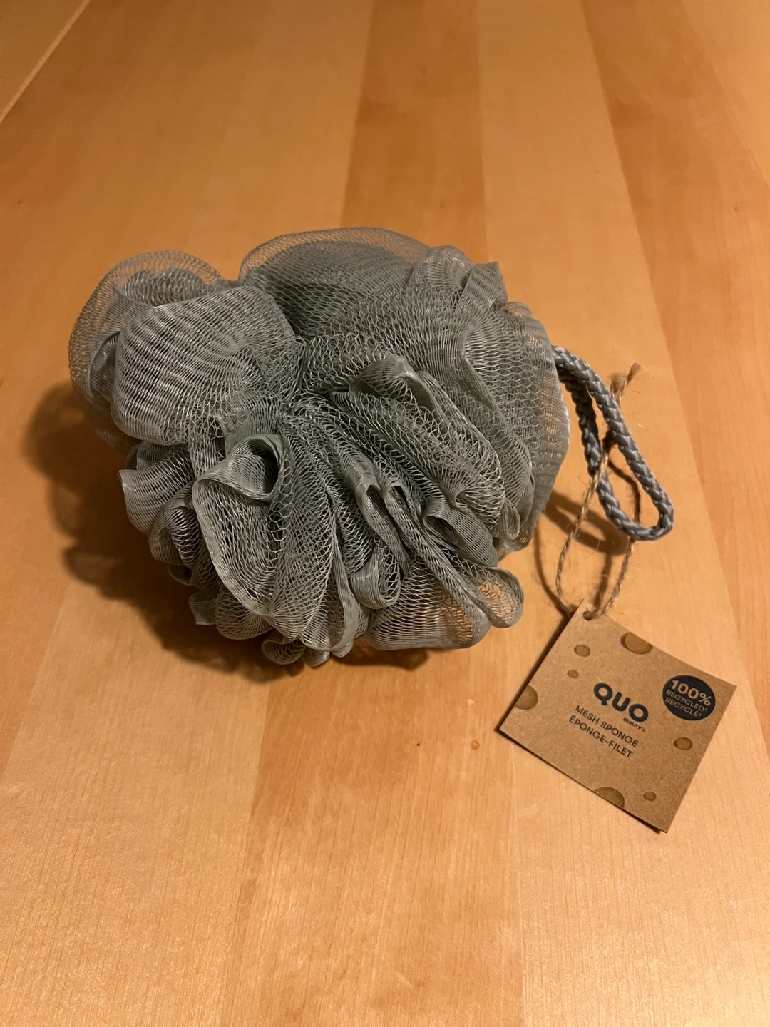 QUO Beauty grey mesh shower sponge for creating a lather. Made with 100% recycled materials. It's great for exfoliating your skin in the shower. Completely new with tag.