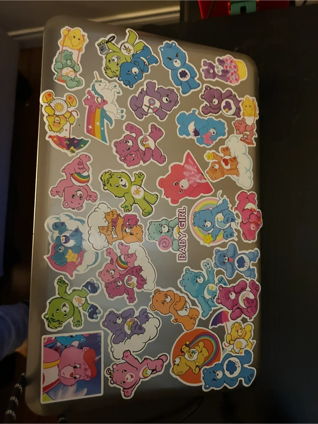 This is an HP laptop featuring an Intel i3 Core processor. It's running Windows and is currently resetting the PC. The exterior is decorated with various Care Bears stickers.