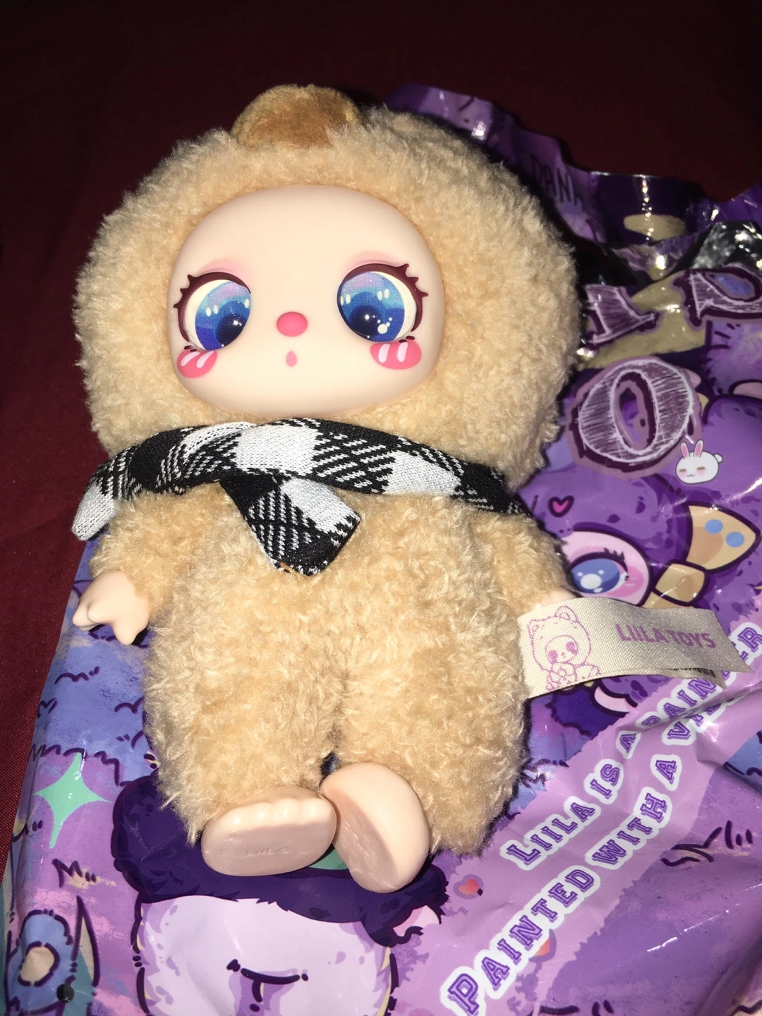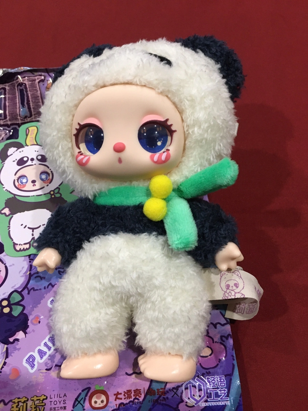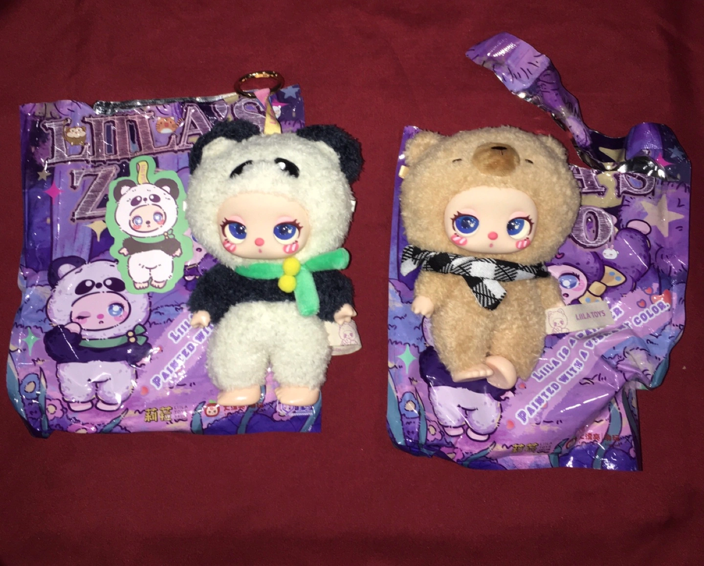 Two Lila Toys blind box dolls are available, one dressed as a panda and the other as a bear. They feature fluffy outfits and distinctive large eyes. Each doll comes in its original packaging.