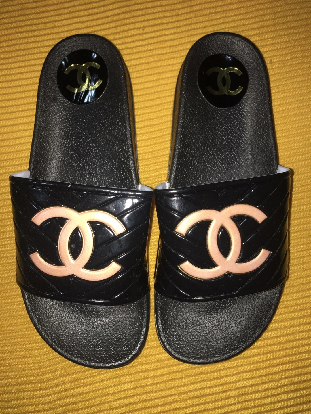 Black slide sandals featuring the iconic Chanel double C logo in a rose gold accent. Comfortable and stylish for everyday wear. Size 7