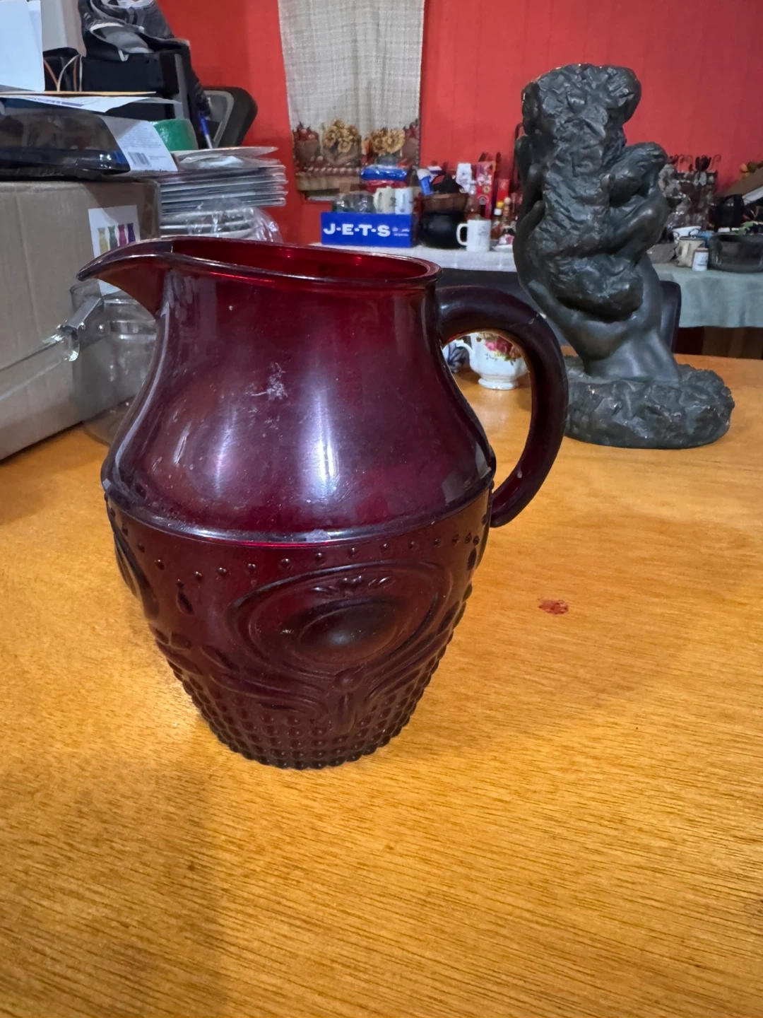 This is a beautiful ruby red pitcher with an intricate embossed design around its base. It's perfect for serving beverages or as a decorative accent piece. The glass material is durable and eye-catching!