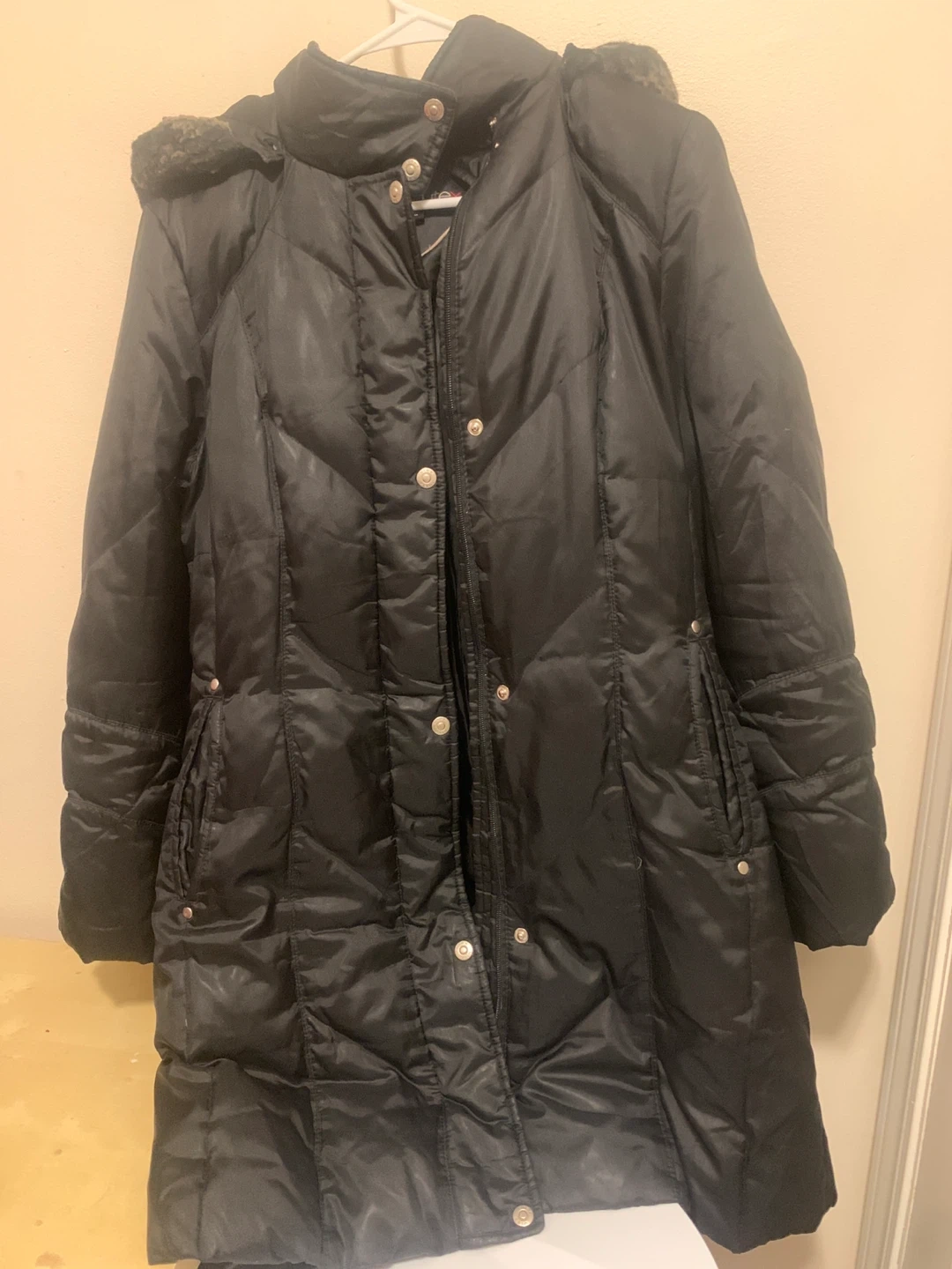 This black down coat is perfect for staying warm. It features a removable hood with faux fur trim and front snap and zipper closure. Two outer pockets and an inner zippered pocket provide storage. Size S.
