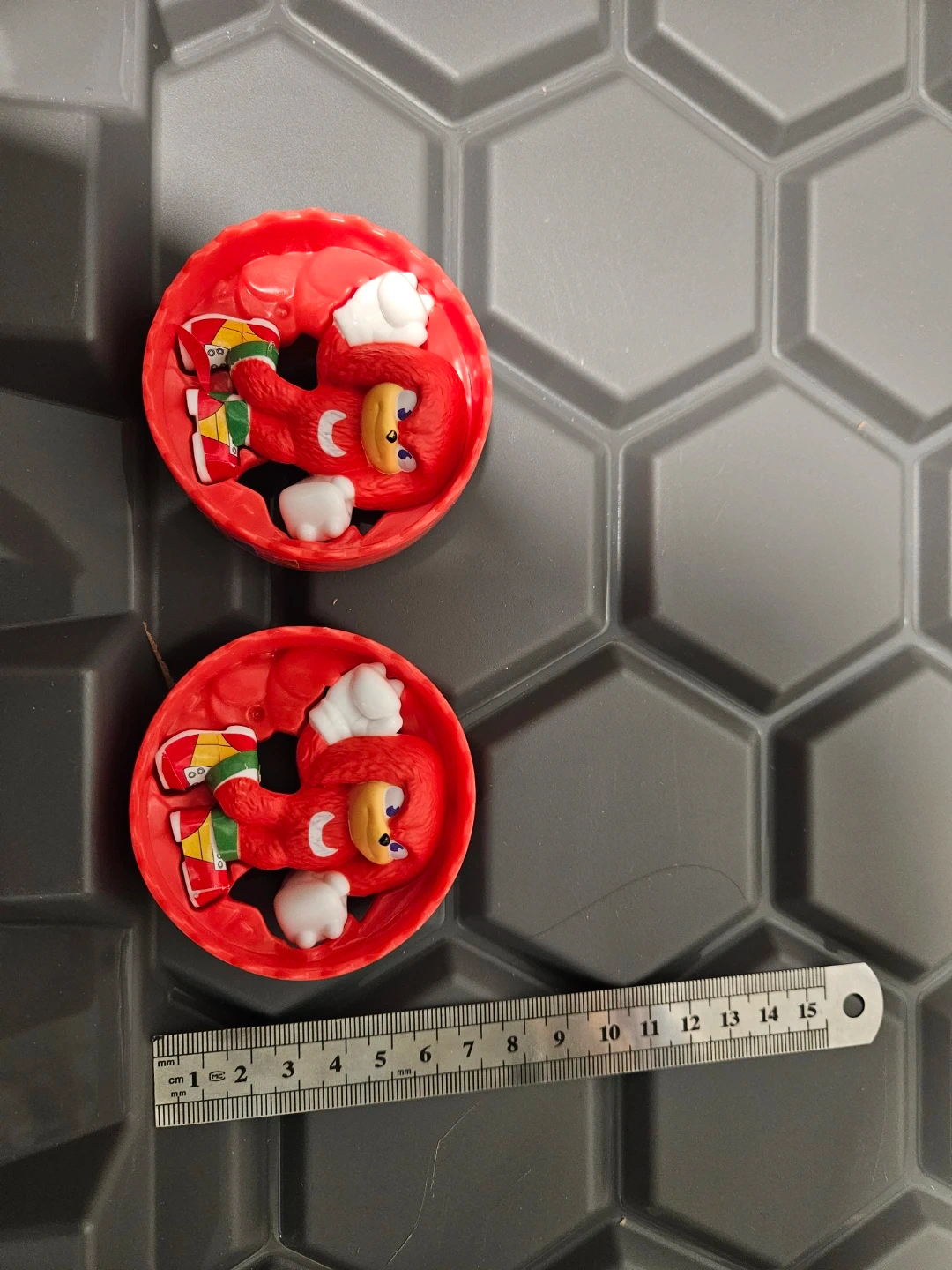 Two Knuckles the Echidna toys are included. They are red plastic figures with white accents. The toys measure approximately 7cm in height. These are collectible items for fans of the Sonic franchise.