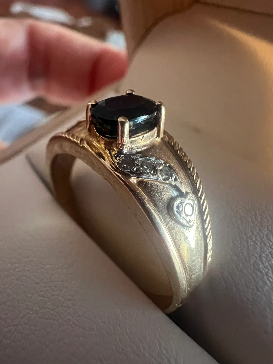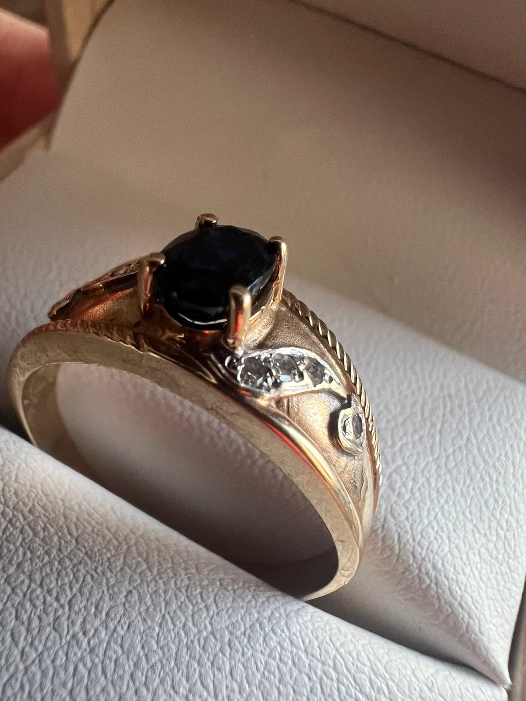 A beautiful gold ring featuring an oval-cut sapphire centre stone, accented by smaller diamond chips on the band. It's a classic piece with intricate detailing. This ring makes a lovely statement for any occasion.