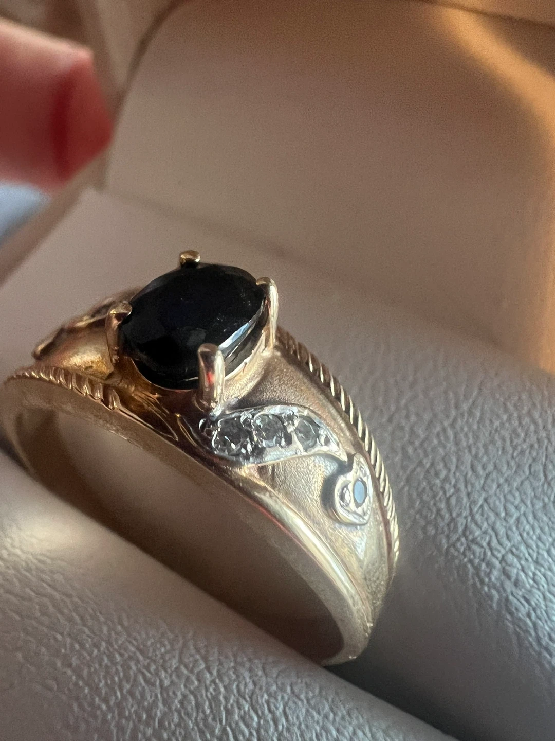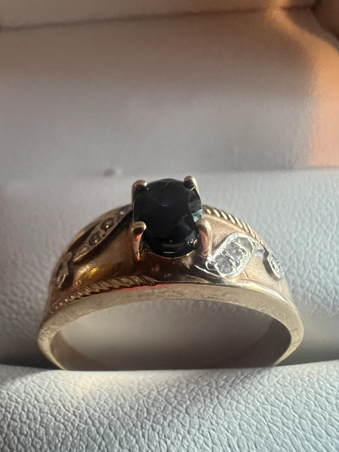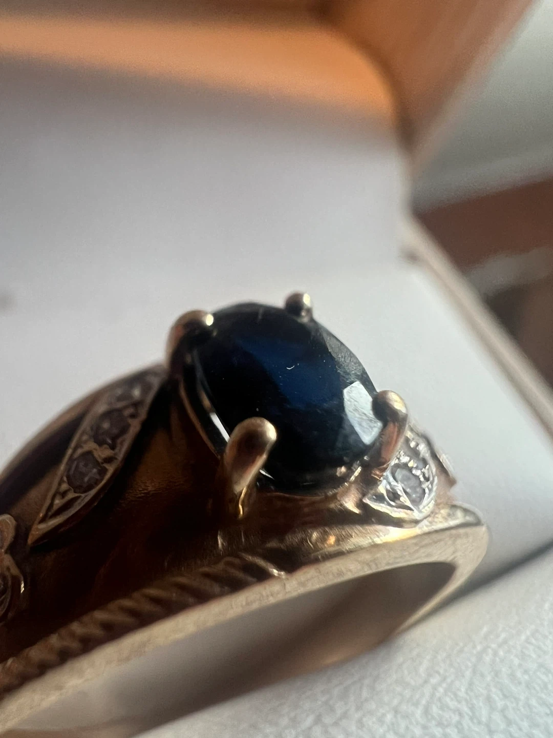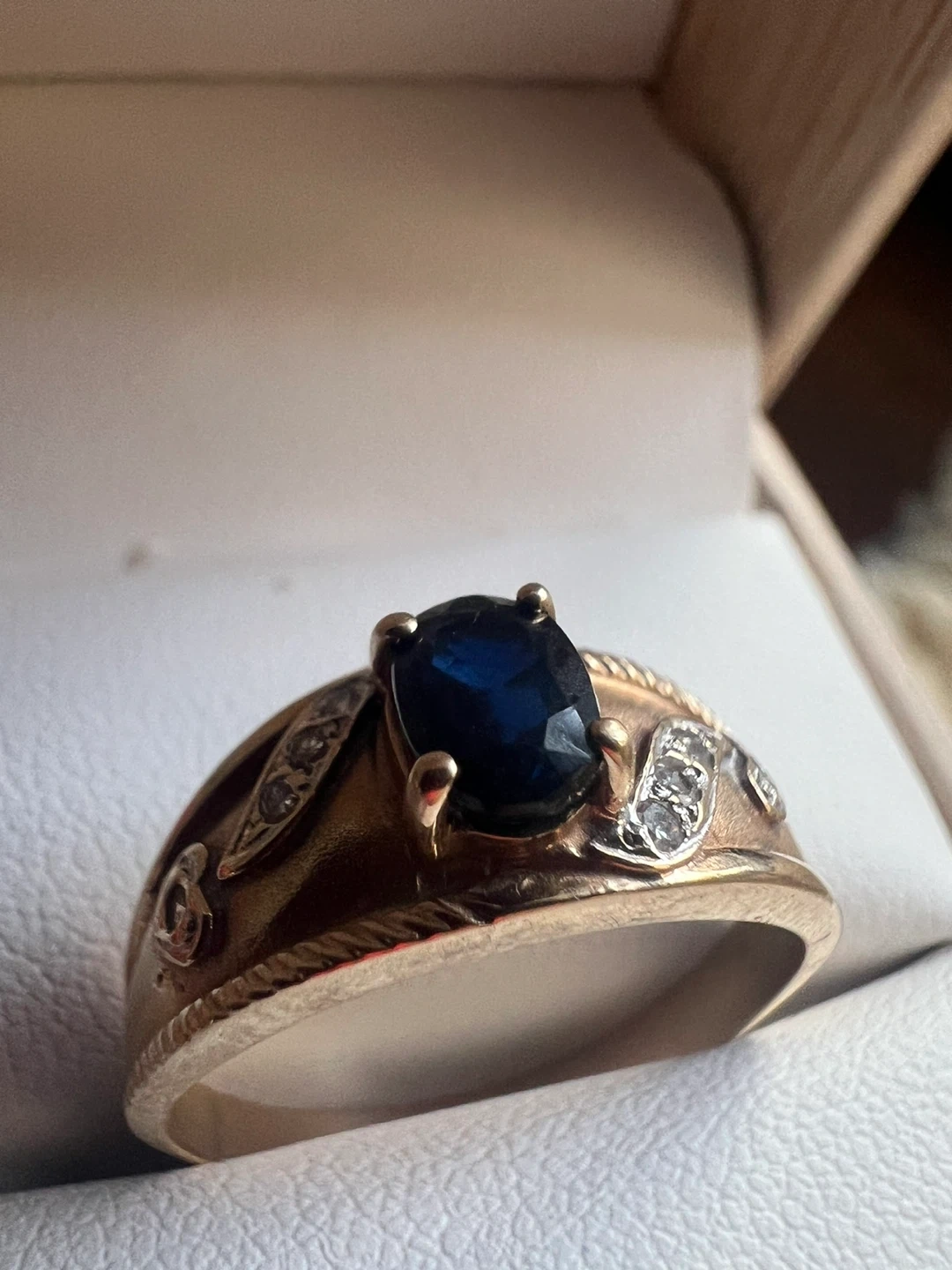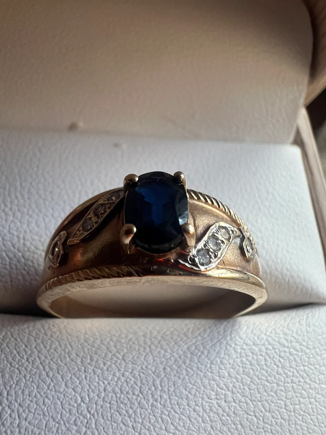 A beautiful gold ring featuring an oval-cut sapphire centre stone, accented by smaller diamond chips on the band. It's a classic piece with intricate detailing. This ring makes a lovely statement for any occasion.