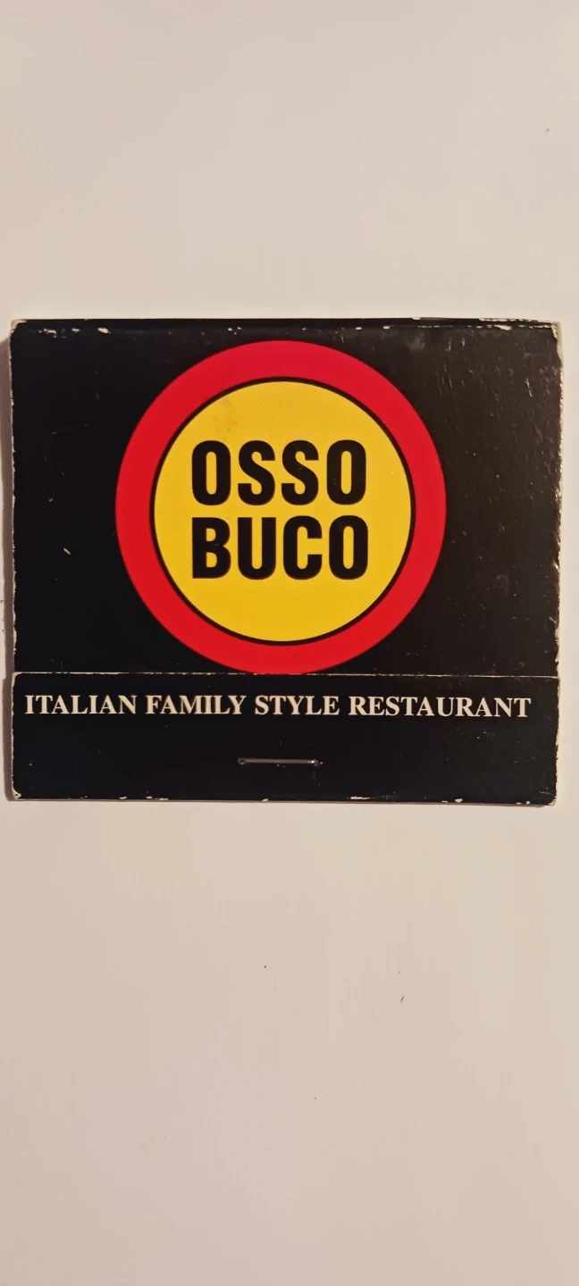 Rare Vintage Collectible matchbook from Osso Buco Italian Family Style Restaurant in NEW YORK CITY Features their logo and restaurant locations in New York City. It's from the 1980s. A neat piece of restaurant memorabilia!!! ALL MY PRICES ARE NEGOTIABLE !! ( The restaurant Osso Buco was permanently closed).