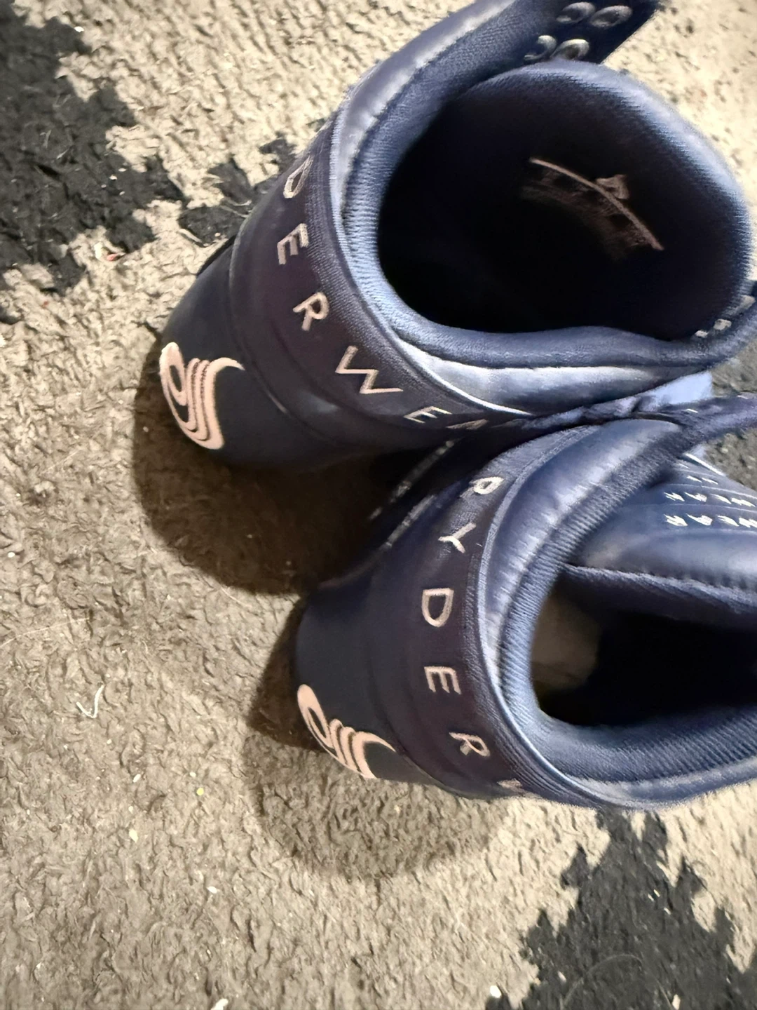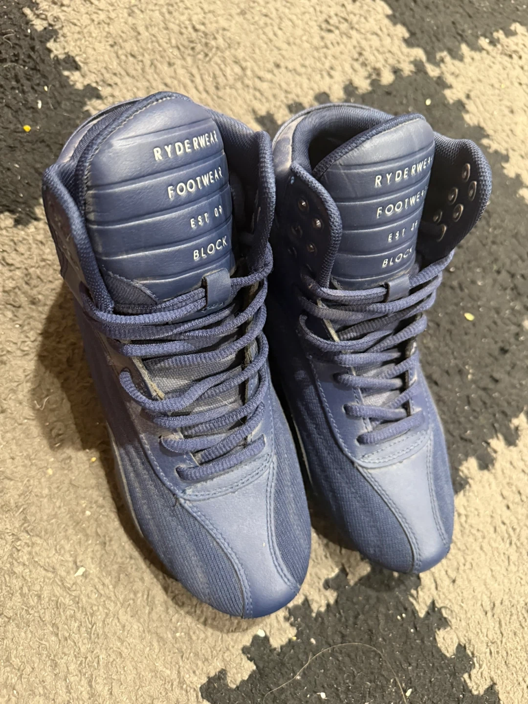 RYDERWEAR high-top shoes for lifting. These dark navy shoes feature a secure lace-up closure. Designed for stability during workouts.