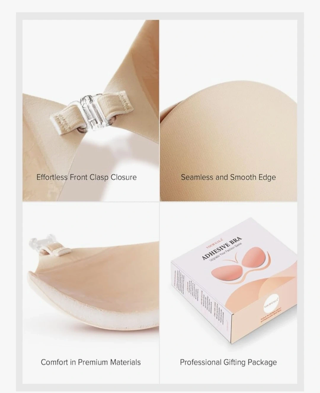 This is a VOCH GALA adhesive bra. It's made with premium polyurethane foam and a breathable soft fabric. The medical-grade adhesive is skin-friendly and washable. This bra provides seamless comfort and is suitable for pregnant women.