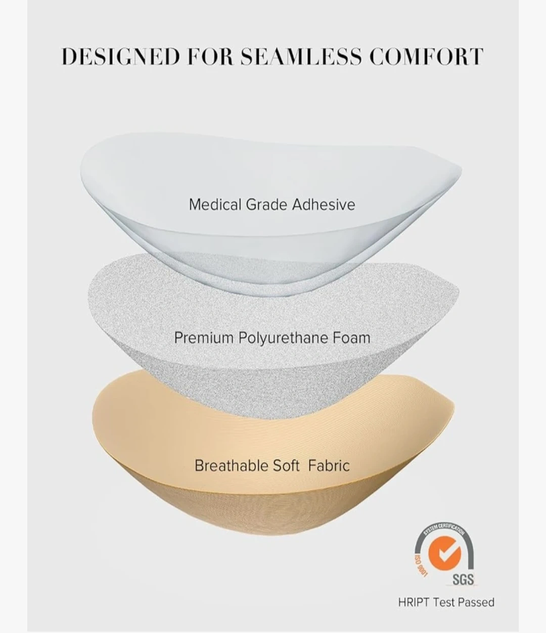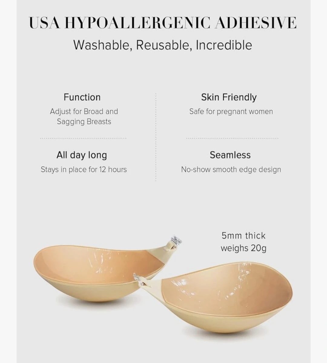 This is a VOCH GALA adhesive bra. It's made with premium polyurethane foam and a breathable soft fabric. The medical-grade adhesive is skin-friendly and washable. This bra provides seamless comfort and is suitable for pregnant women.