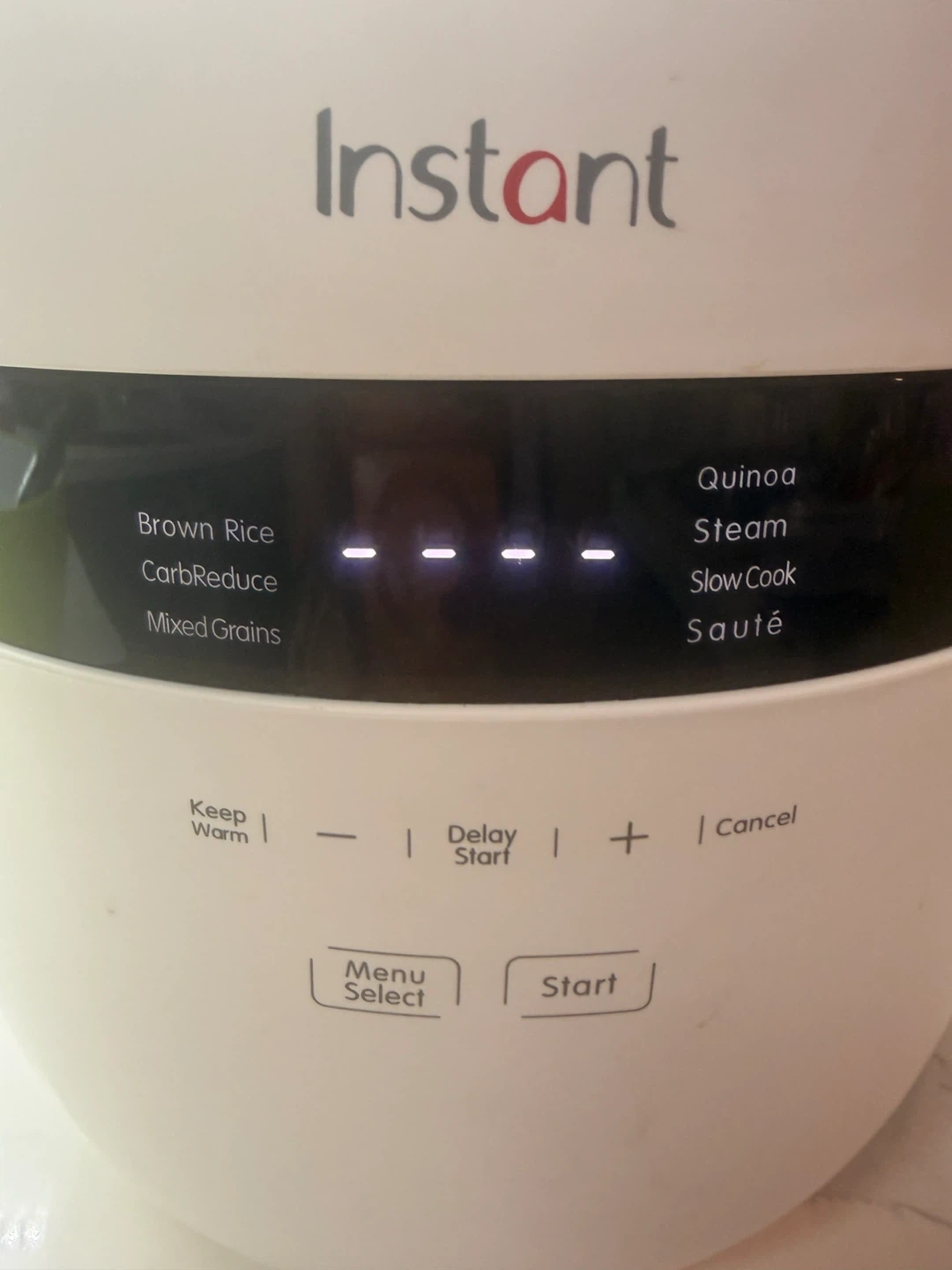 Instantpot rice cooker with multiple cooking functions. It has settings for Brown Rice, CarbReduce, Mixed Grains, Quinoa, Steam, Slow Cook, and Sauté. Includes a measuring cup and serving spoon. Perfect for anyone looking to enjoy fluffy rice with reduced sugar content — ideal for healthier eating without sacrificing taste.