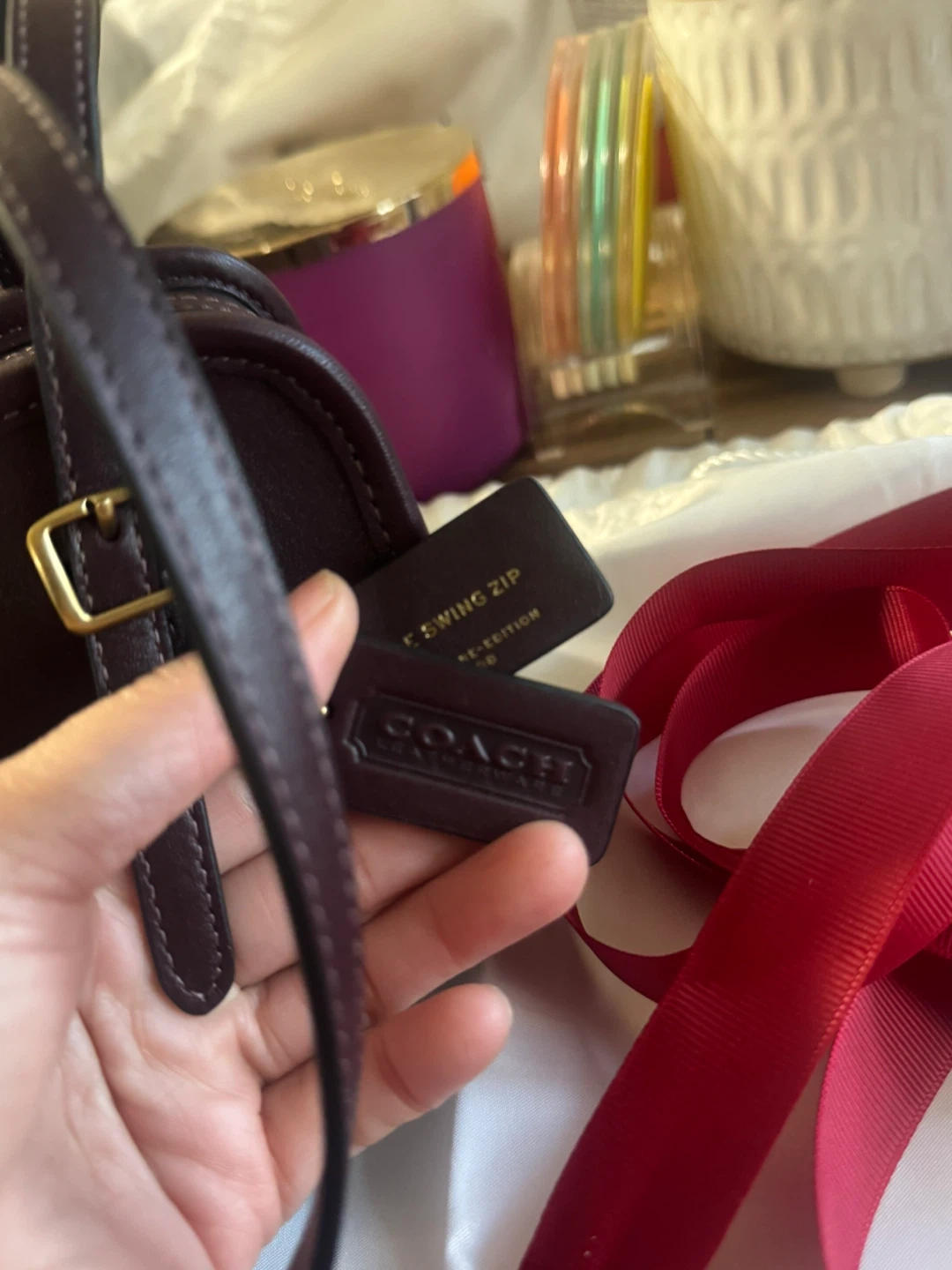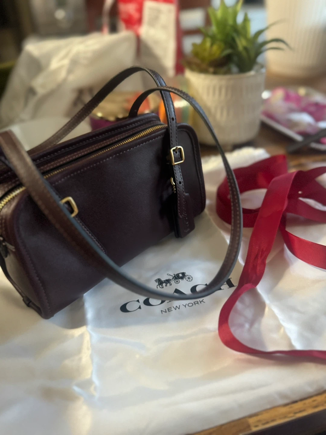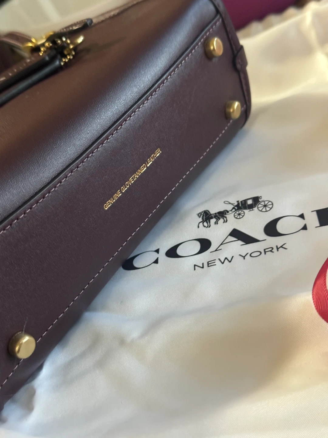 This is a dark burgundy Coach shoulder bag made of genuine glovetanned leather. It features a zip closure and an adjustable strap. It's a classic accessory for everyday use.