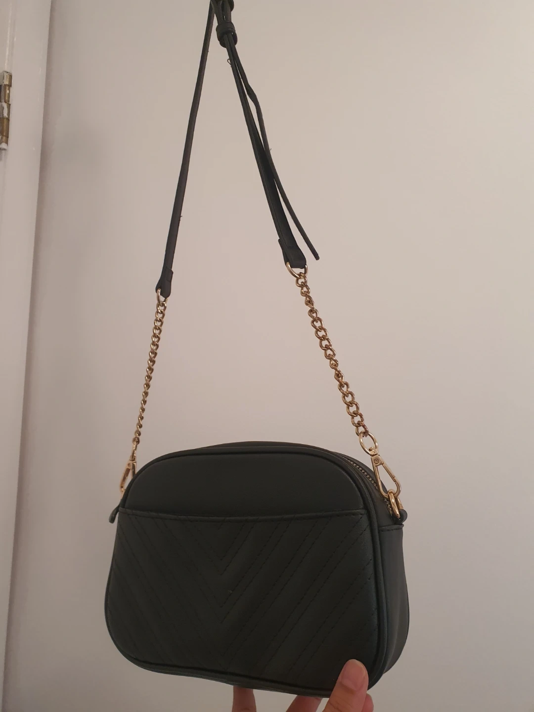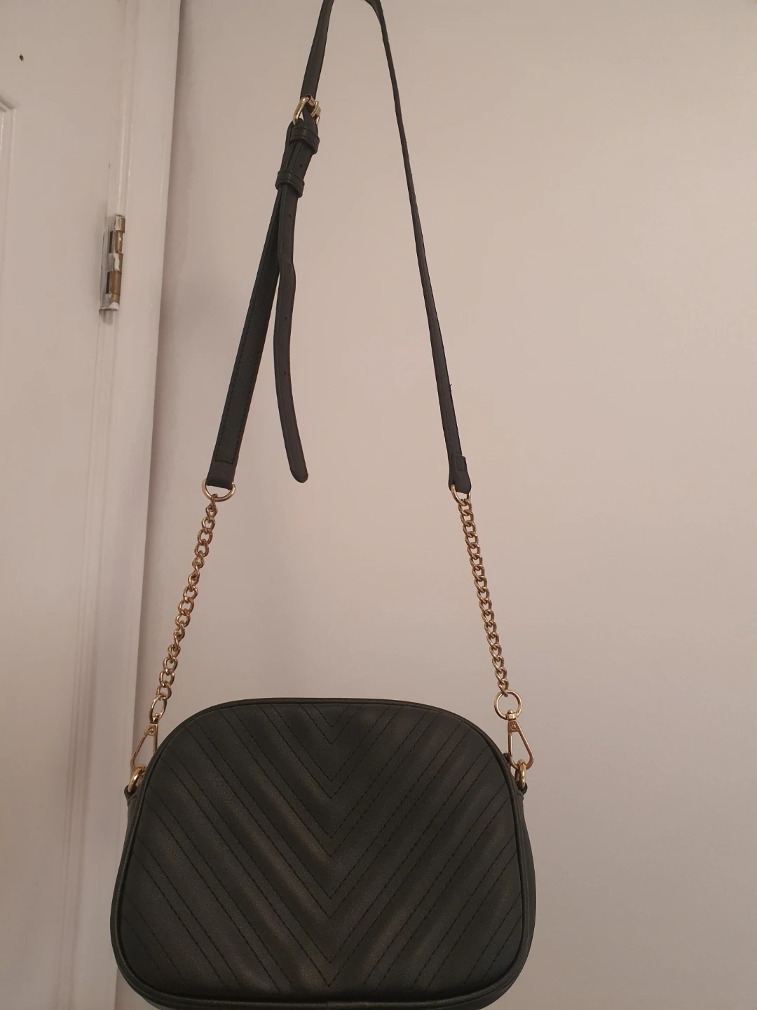 Lola & Mae crossbody bag with gold chain strap. This bag has a quilted chevron design on the front. Zipper closure with a spacious interior.