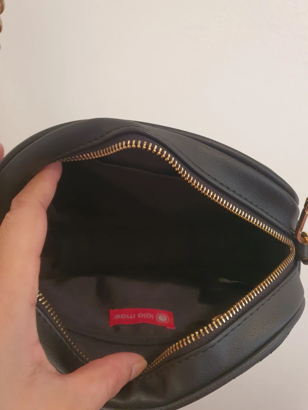 Lola & Mae crossbody bag with gold chain strap. This bag has a quilted chevron design on the front. Zipper closure with a spacious interior.