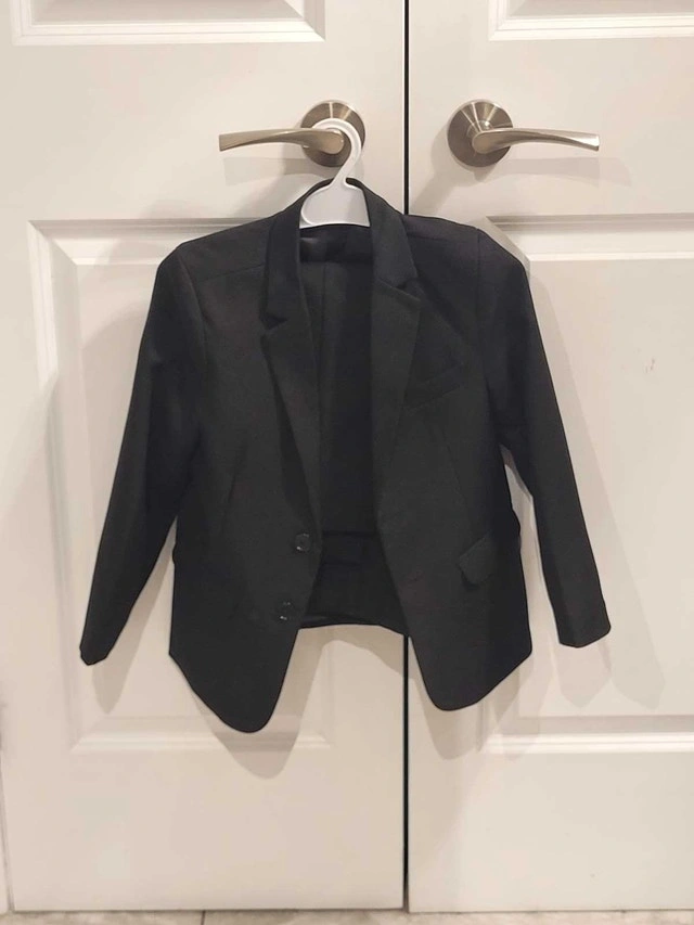 This stylish boys' George black suit, size 5, is perfect for formal occasions! Has been worn only a few times and is in like new condition. Is ready to make your little one look dapper! $20.00.
