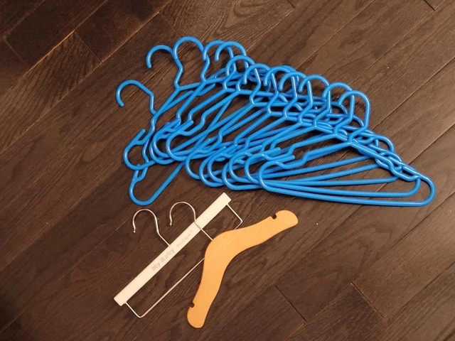 Offering a set of baby and children's hangers, perfect for keeping your little one's closet organized. This lot includes a mix of blue plastic hangers, a wooden hanger, and a plastic hanger for pants/blankets/etc. They are used, but in excellent condition. They've been great for keeping clothes neat and tidy!