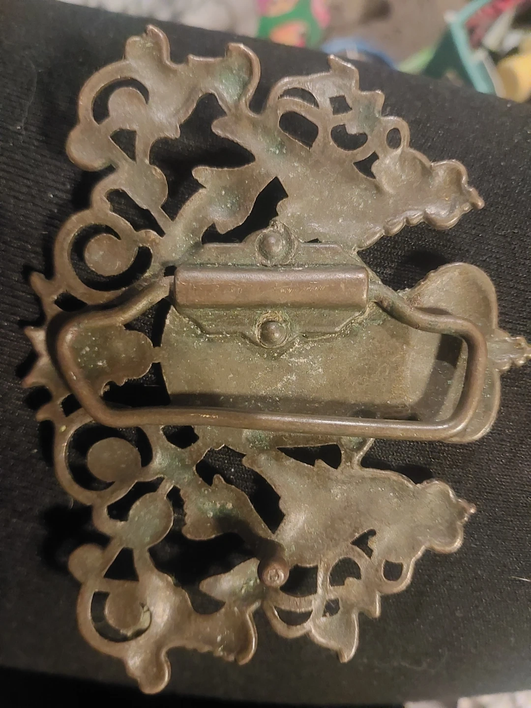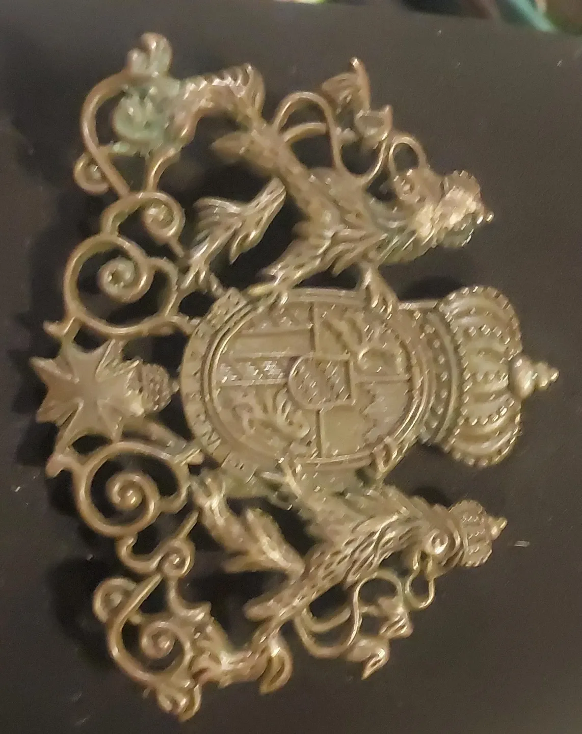 This vintage belt buckle features an ornate design with dragons and a crown. It appears to be made of metal with an antique brass finish. The intricate detailing makes it a unique accessory.