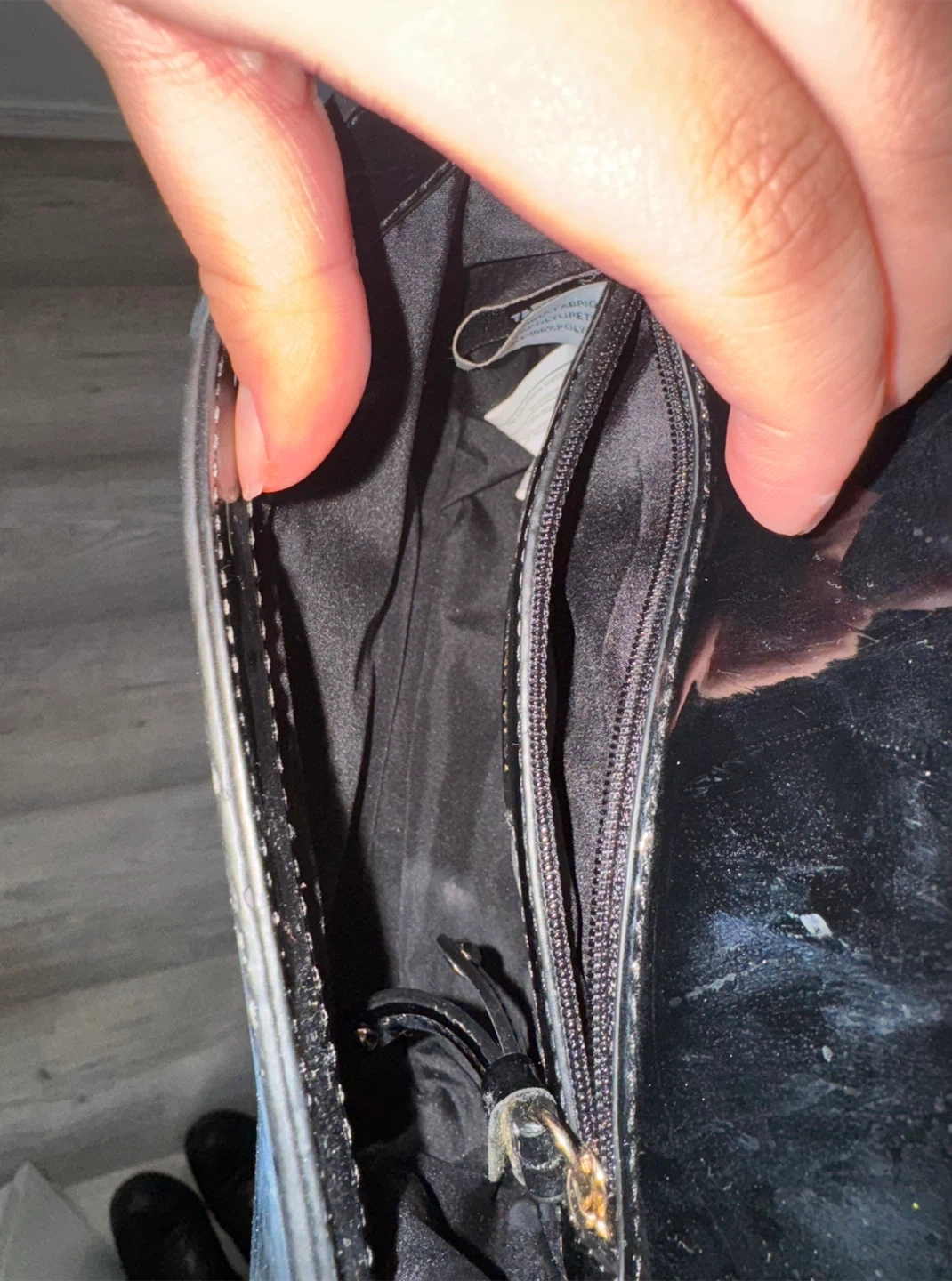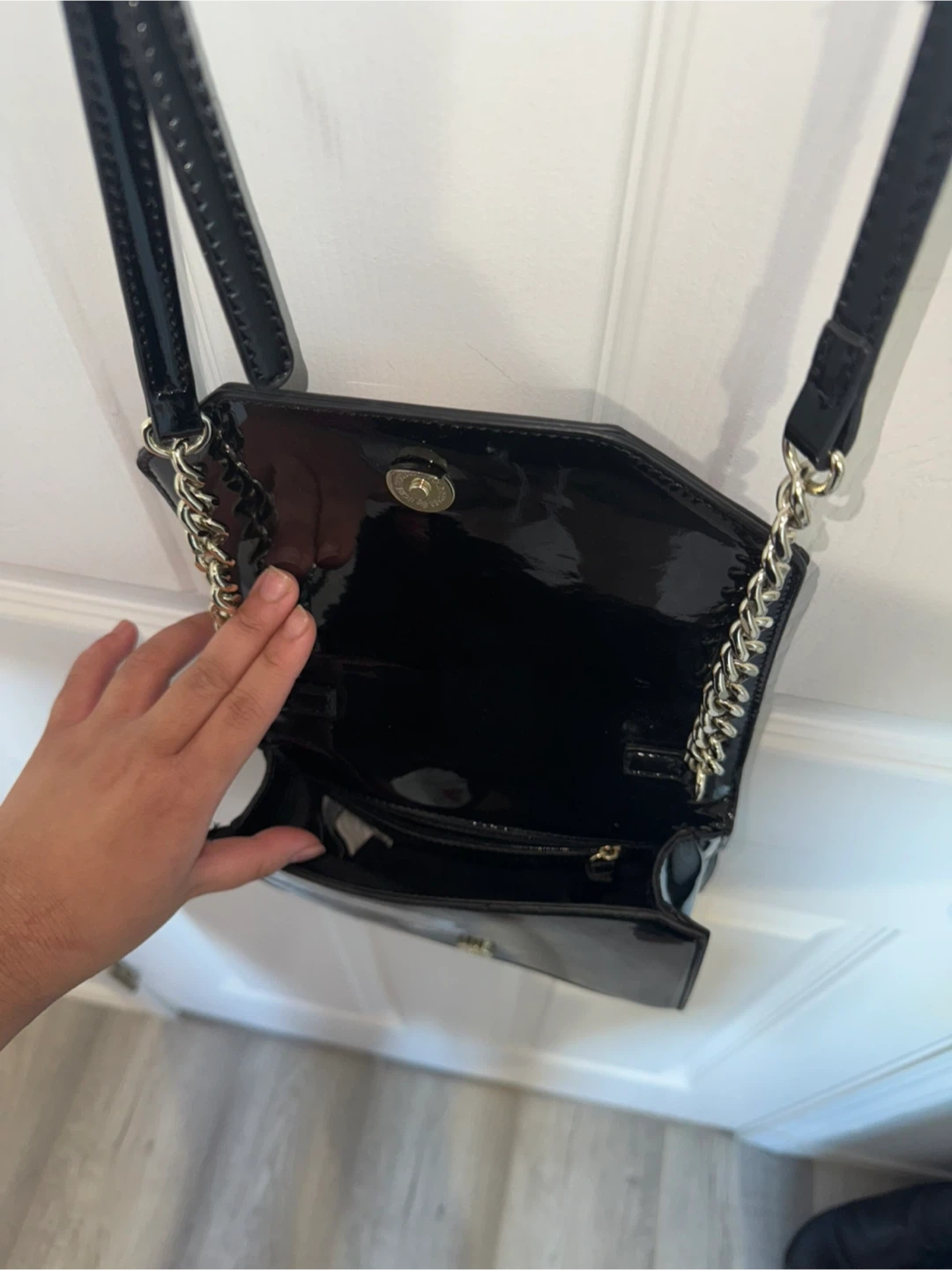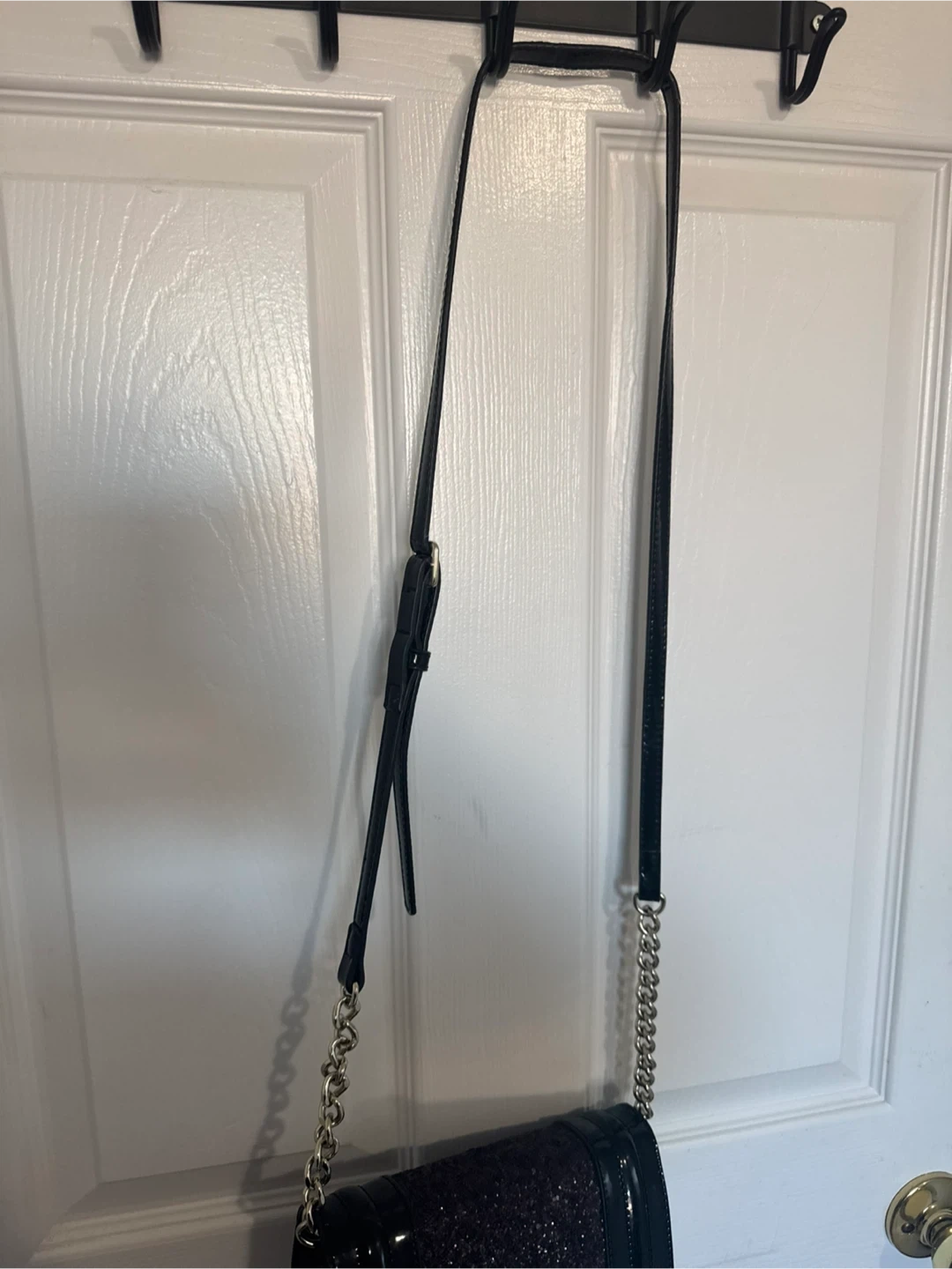 Has a shiny black patent exterior with a glitter embellished flap. It has a chain and an adjustable strap for versatile wear. The interior includes a zippered pocket. Perfect for evening parties, date nights, and special occasions!
