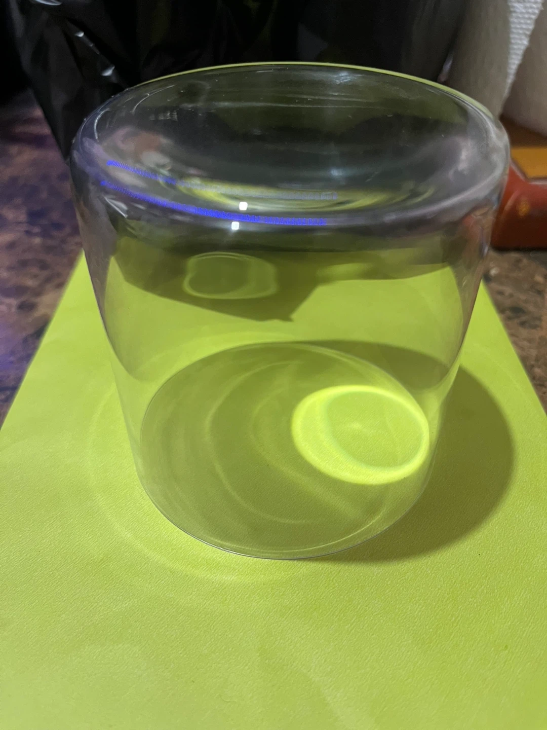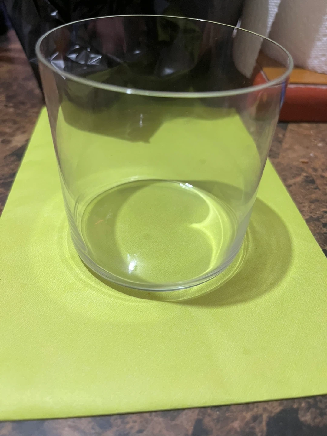 This is a clear glass tumbler. It's made of glass and measures 4 inches tall with a 3.5-inch diameter. It's a versatile container that can hold beverages or be used for decor. It's perfect for everyday use or special occasions!