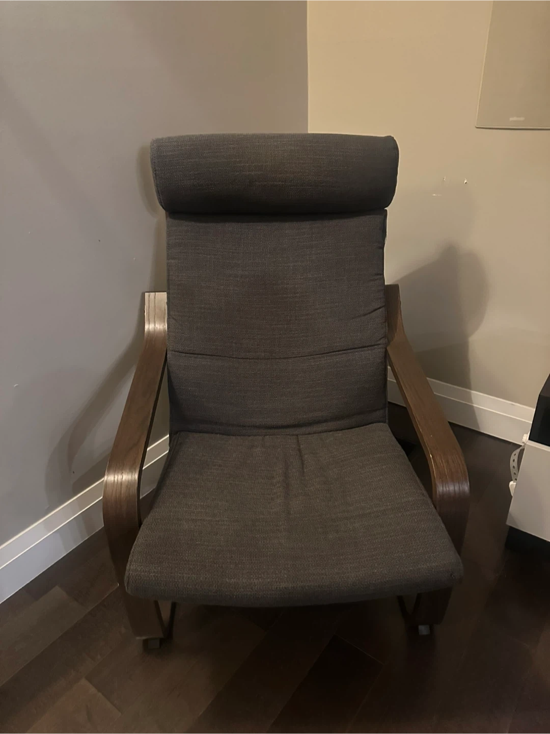This comfortable lounge chair features dark grey fabric upholstery and curved wooden armrests. It has a tall back and a built-in headrest for extra support. The base has small wheels for easy moving. It's a great addition to any living space or reading nook!